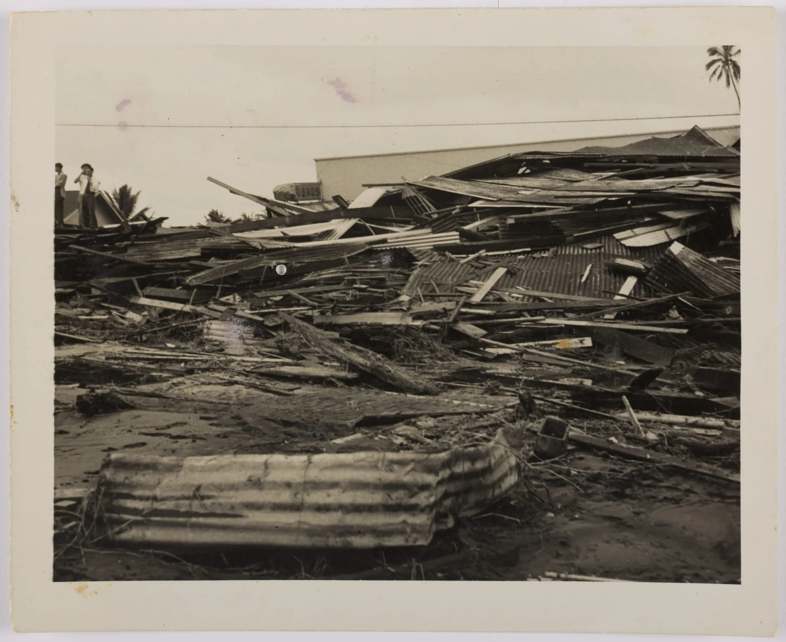 Black and white photograph of a large field of collapsed corrugated metal roofing and splintered lumber, with two small figures standing in the distance and a palm tree visible at the upper right