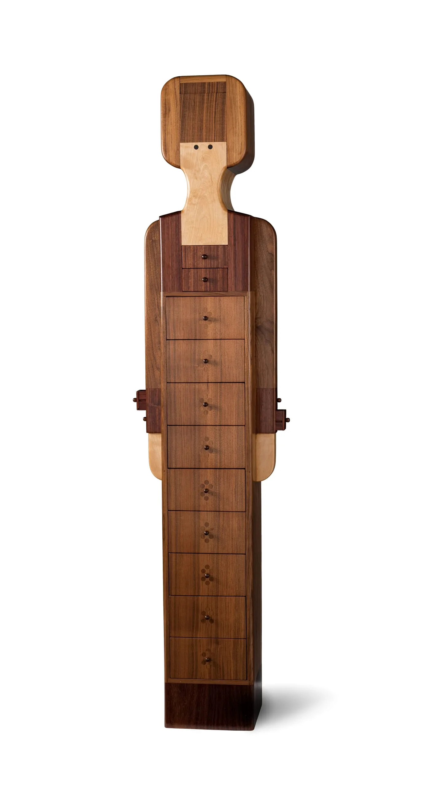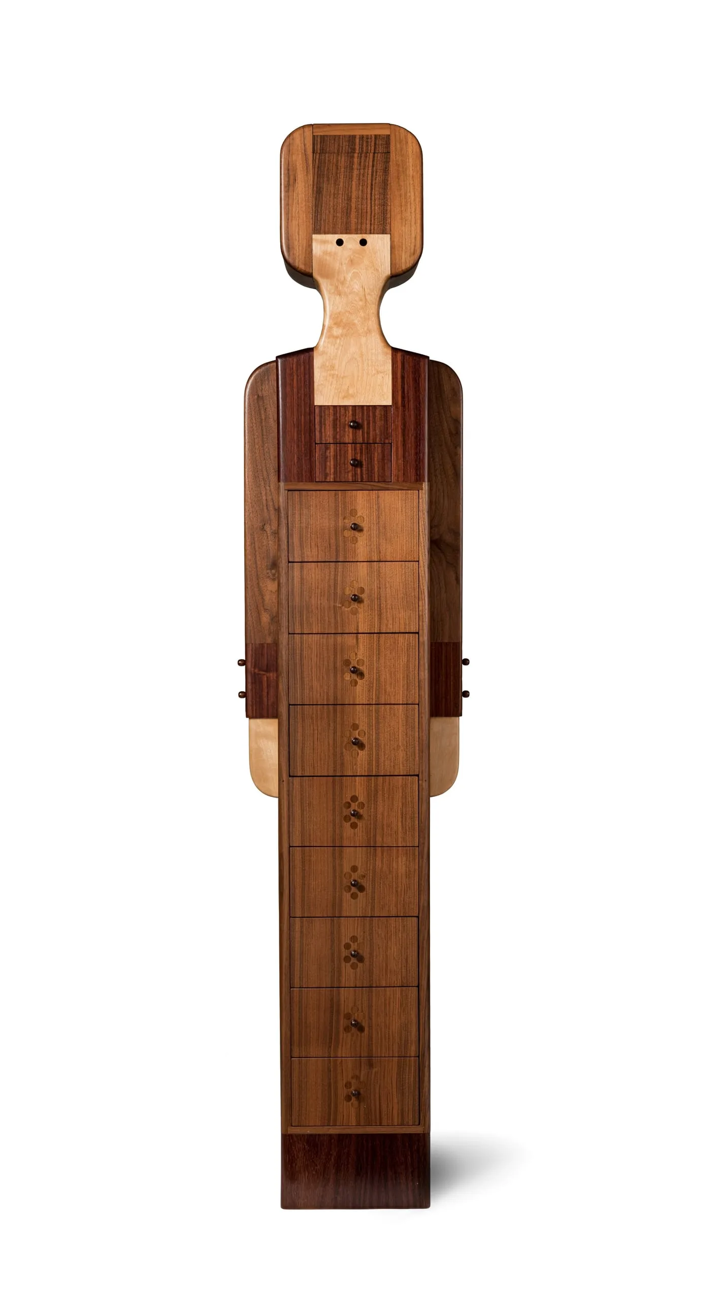 A sculptor in wood among other media, Pamela Weir-Quiton was introduced to woodworking in a class at California State University, Northridge. For the final assignment to make a piece of furniture, Weir-Quiton crafted a chest of drawers in the shape of an over-lifesize doll. The result was Sloopy, named after the hit McCoys song of 1965 "Hang on Sloopy." In the song, Sloopy "lives in a very bad part of town, and everybody (yeah) tries to put my Sloopy down." As a rare woman in a field dominated by men, Weir-Quiton closely identified with Sloopy’s marginalized status and the towering female doll allowed her to assert her rightful place in the field.