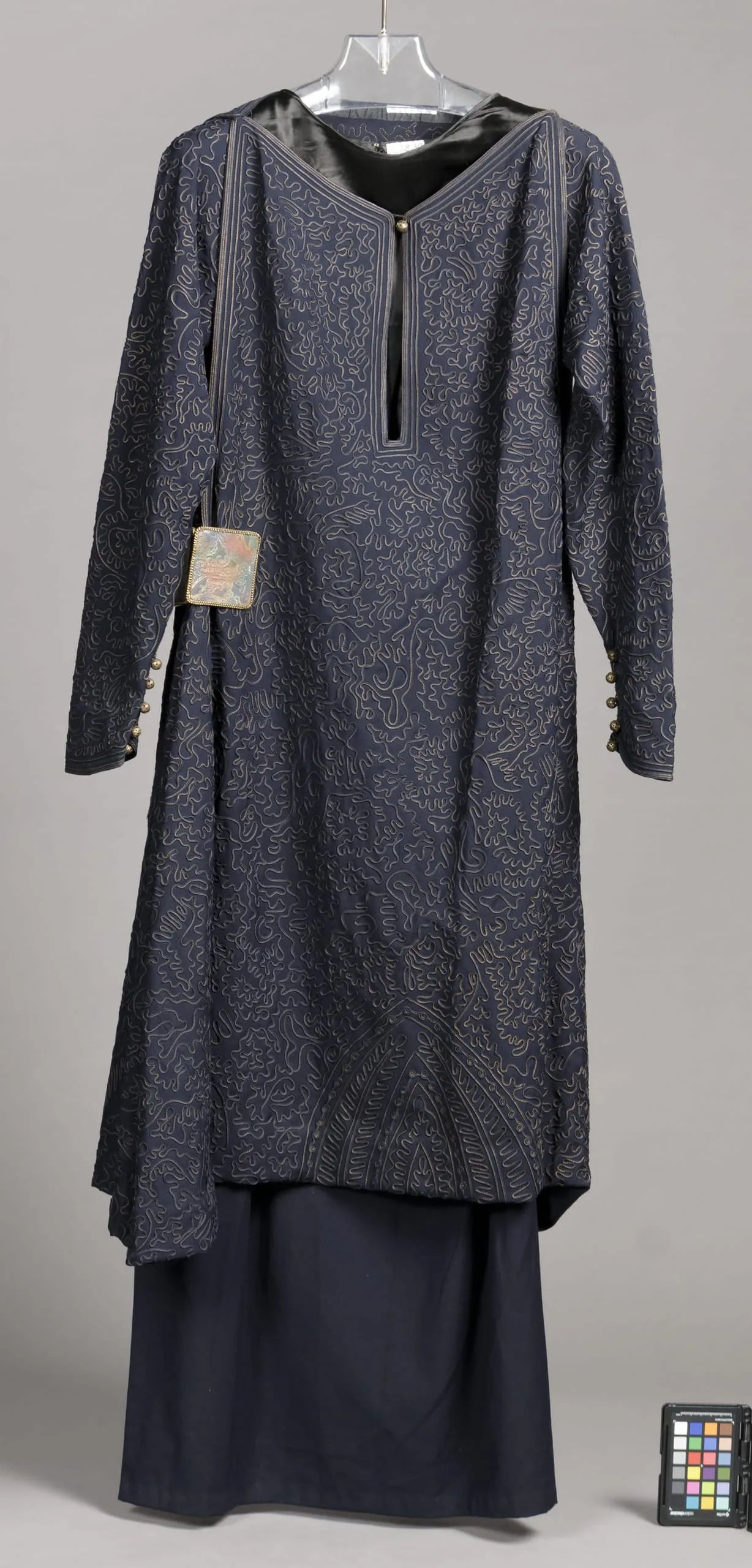 - Wool twill (serge), silk satin, silk and metallic thread cord, metal buttons, painted leather and metal clasp