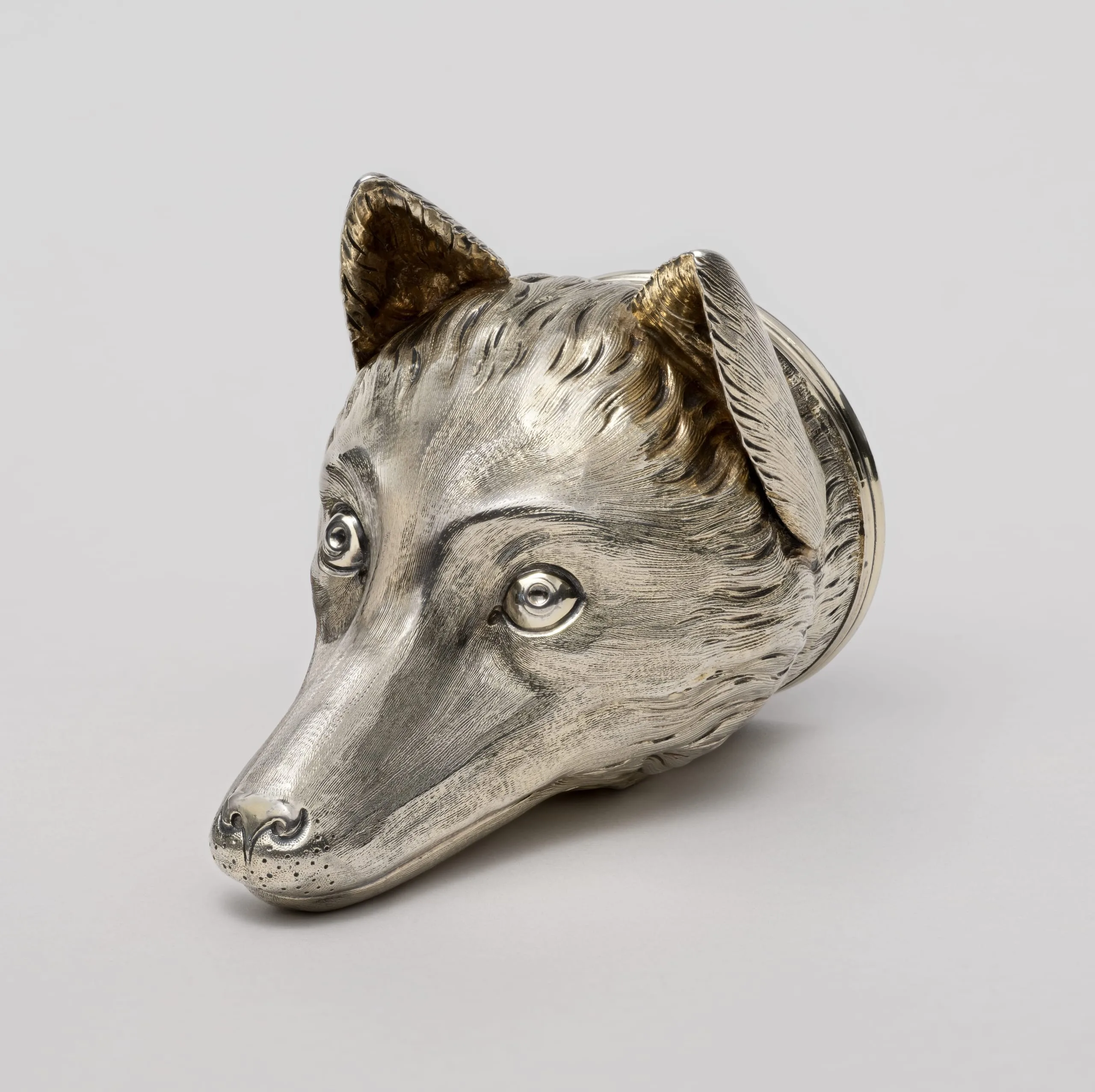 A stirrup cup refers to a small alcoholic farewell drink offered to horse riders "in the stirrups," as well as the vessel in which this libation was served. Stirrup cups in the form of a fox’s heads are a distinctly British type developed in the second half of the eighteenth century for use in the elite sport of hunting foxes on horseback. The prevailing Neoclassical design style was inspired by excavations of the ancient Italian sites of Herculaneum and Pompeii that had been buried by the volcanic eruption of Mount Vesuvius in 79 CE. Catering to their wealthy clients’ antiquarian tastes, craftspeople studied ancient cups in the form of animal heads illustrated in catalogs of famous archaeological collections such as those belonging to the British ambassador to Naples, Sir William Hamilton (1730-1803). The particular design of this stirrup cup was produced by a silver workshop where women held prominent roles. Although married women in Britain could not own property until 1870, widows could, and the marking system established to guarantee the purity of precious metal documents their participation in the silver trade. Hallmarked for Peter and Ann Bateman (a brother- and widowed sister-in-law partnership), this cup was cast in a mold made when Ann’s widowed mother-in-law Hester Bateman (1709-1794) ran the firm, and demonstrates continuity across this multigenerational family business.