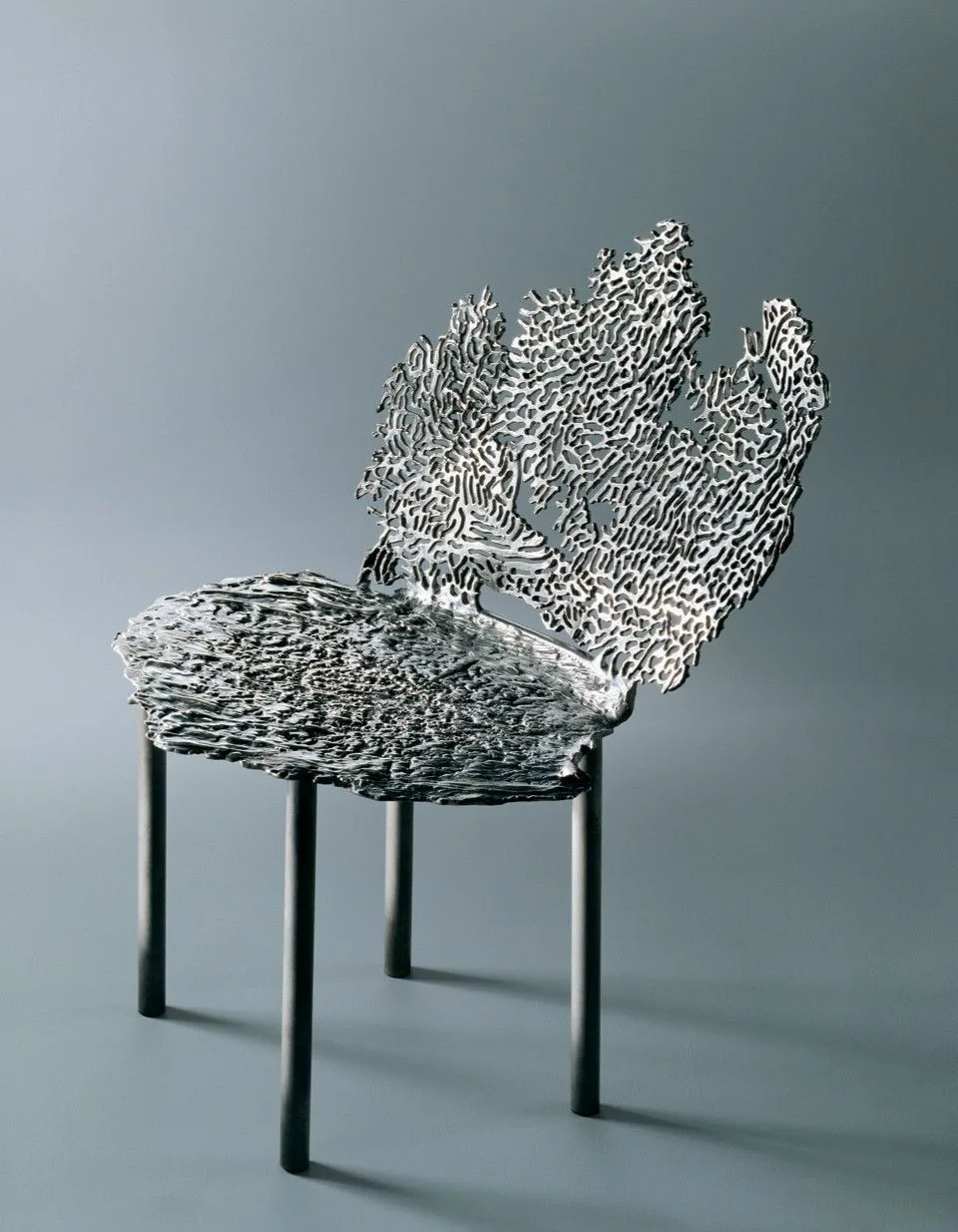 Each of the chairs Oka Doner has designed is unique except this one, which is not only the first Coral Wave, but also the only one to be executed in silver. After seeing the silver example in Oka Doner’s studio, the interior designer Peter Marino commissioned three others for Feldpausch, a fashion house in Zurich. They were made in bronze three years later, in 1993.