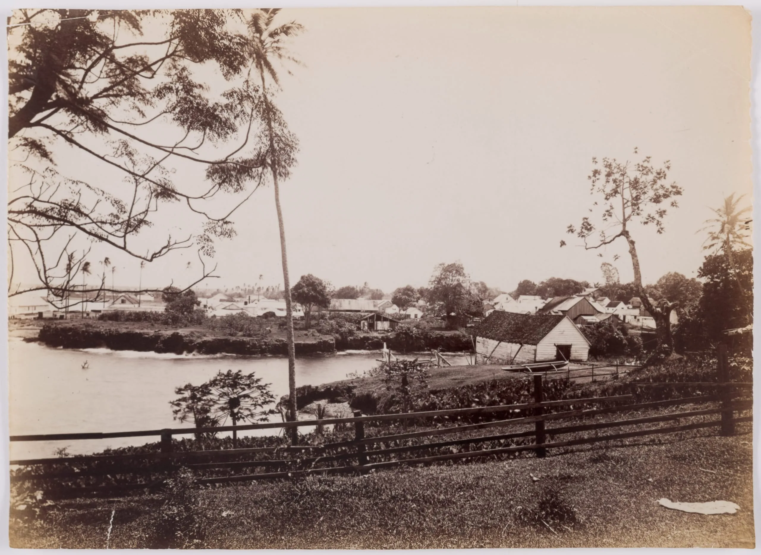 Sepia-toned photograph of a tropical river settlement viewed from a grassy hillside, with a wooden fence in the foreground, palm trees, and low-roofed buildings along the water's edge
