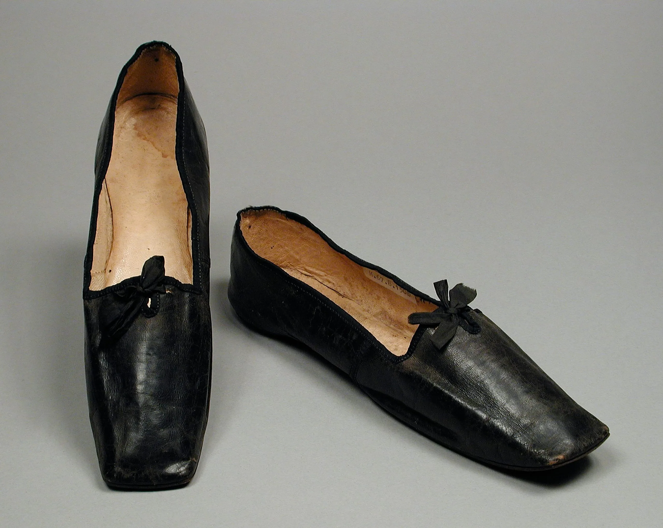 Pair of flat black leather slippers with square toes and small ribbon bows, one upright and one on its side, showing worn exterior and pale tan lining