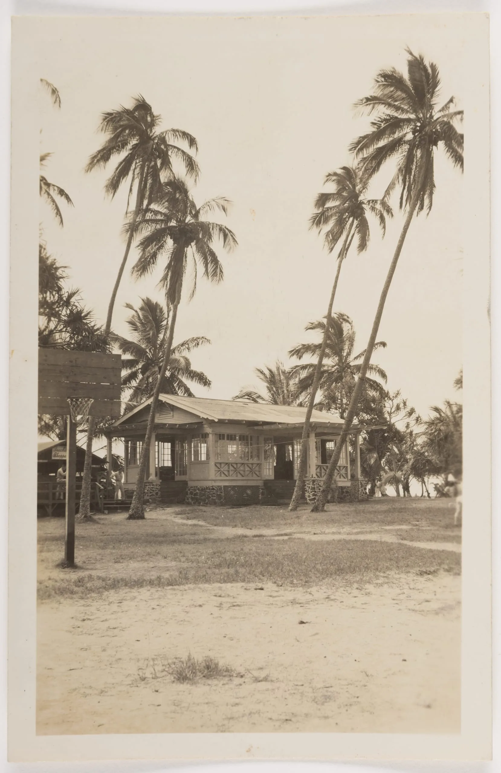 Sepia-toned photograph of a low, wide building with a covered porch surrounded by tall coconut palms on a sandy lot