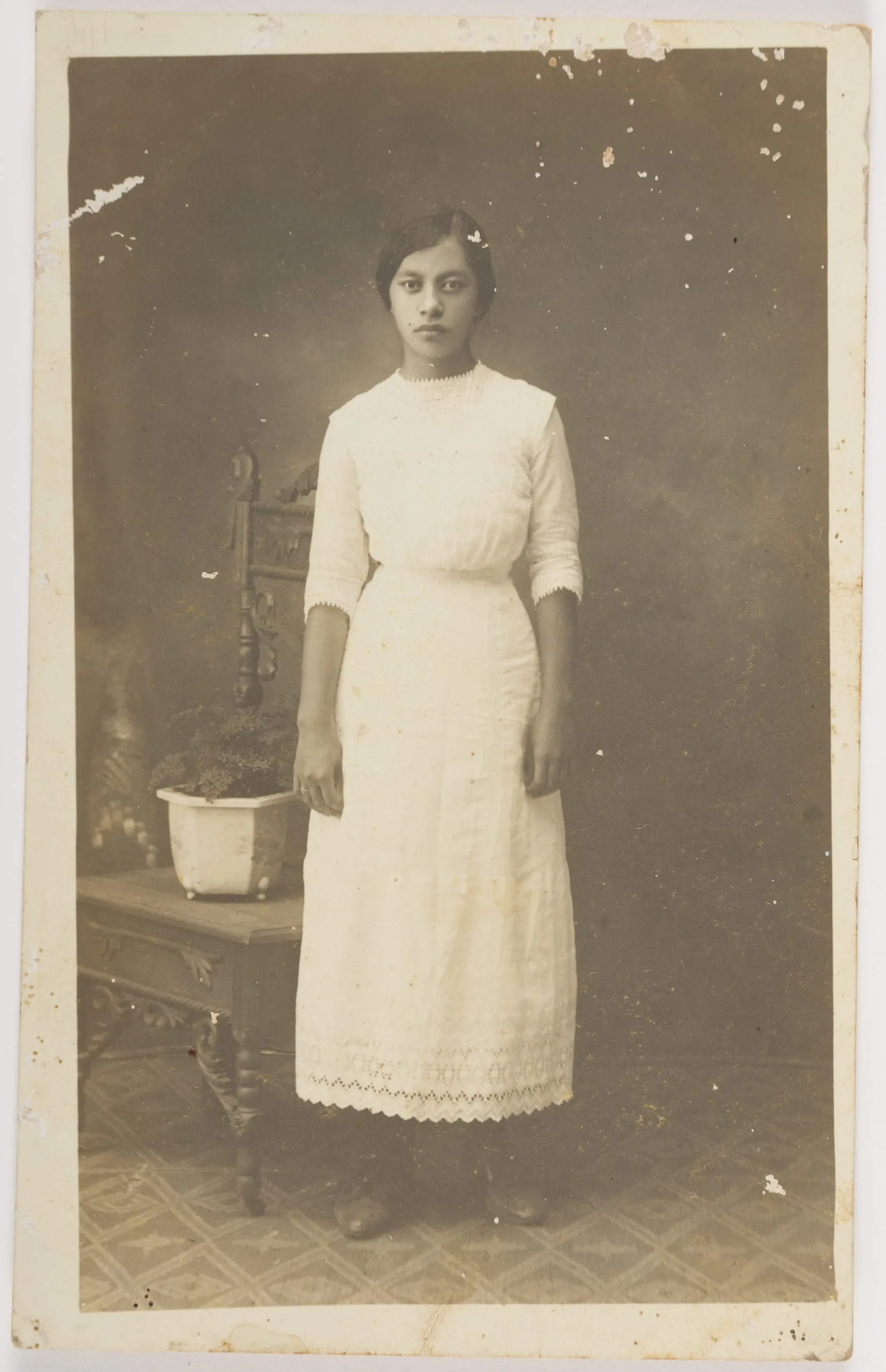 Sepia-toned full-length studio portrait photograph of a young woman in a white high-necked, ankle-length dress with lace-trimmed cuffs and hem, standing before a mottled backdrop