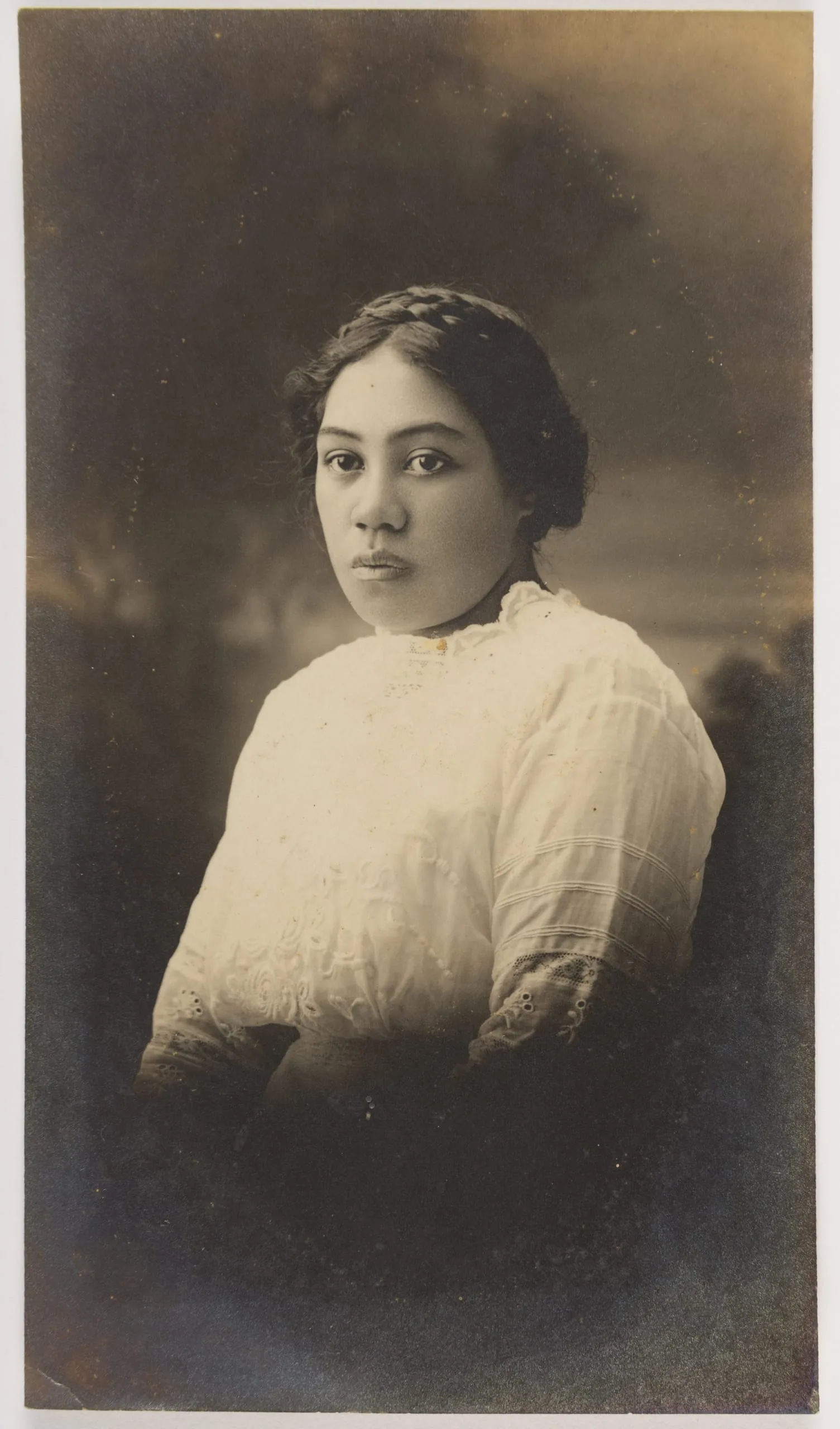 Sepia-toned portrait photograph, woman with brown skin and braided crown hair, seated in three-quarter pose wearing a white lace-trimmed blouse