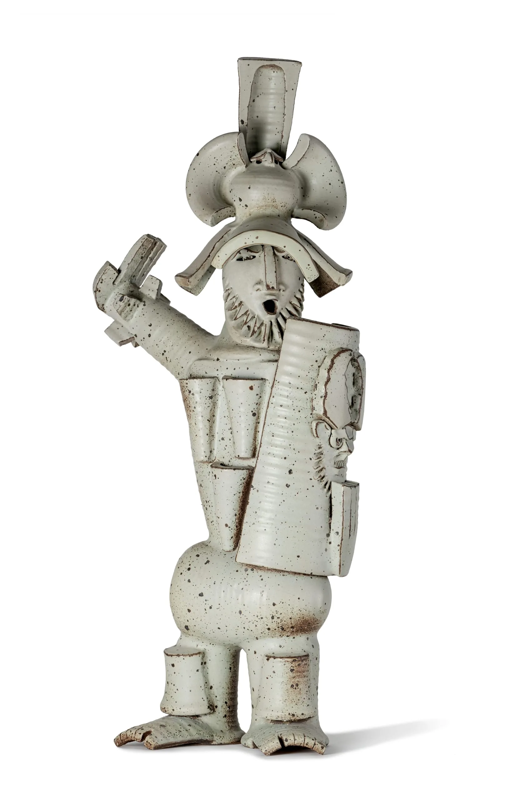 In the late 1960s through the 1970s, De Larios made several Warrior sculptures, demonstrating her increasing confidence as an artist. Influenced by ancient West Mexican figurines that the artist had seen in both Los Angeles and Mexico, the Warriors had distinctive, expressive faces and a range of dynamic poses. Their hollow forms recall Japanese haniwa tomb sculptures, but unlike those slab and coil built forms, De Larios’s work was assembled from thrown elements. This Warrior from 1970 incorporates an owl and a ram, animals that recur frequently in the artist’s work.