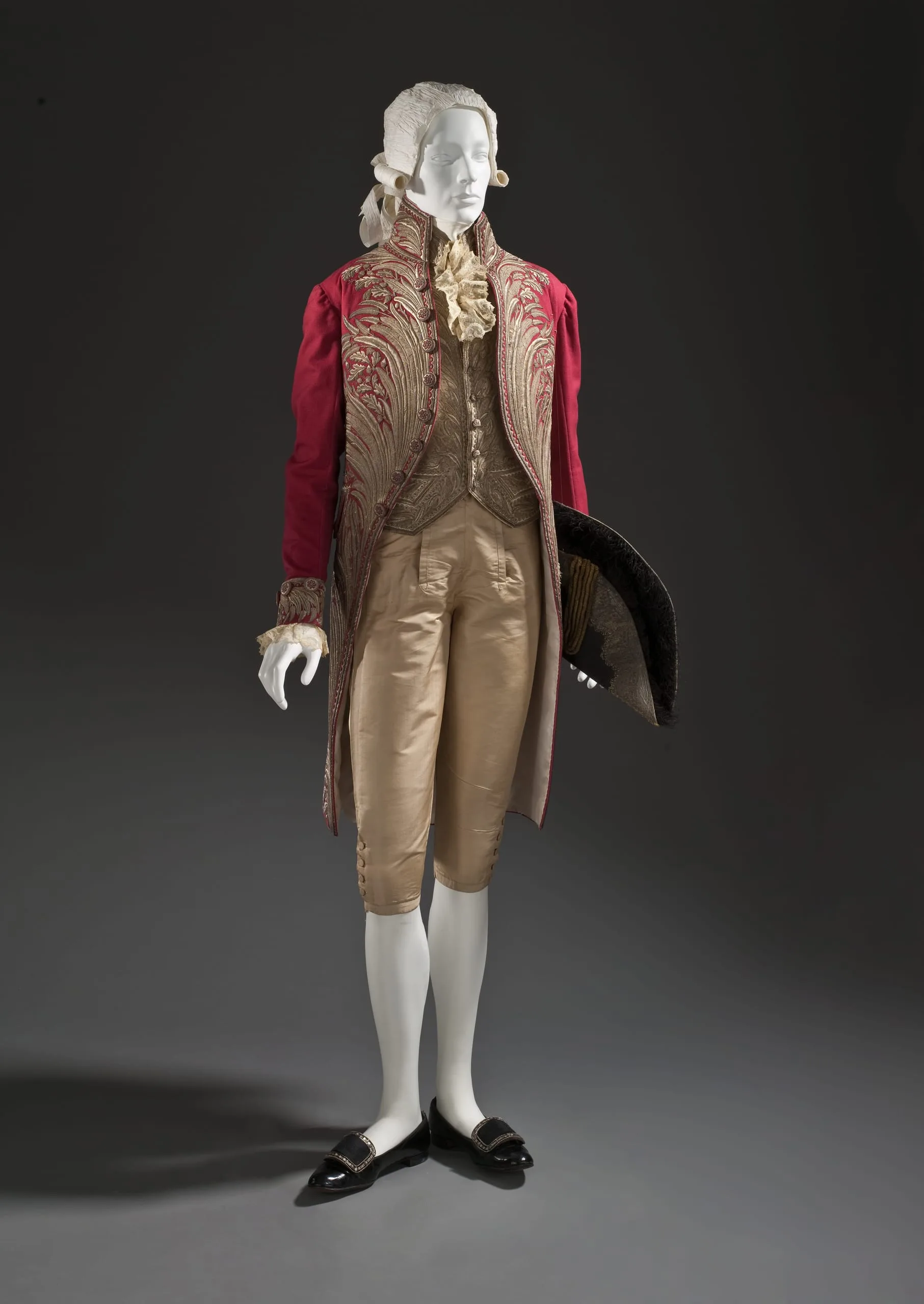 - Wool felt, beaver fur, ostrich feathers, and metallic passementerie