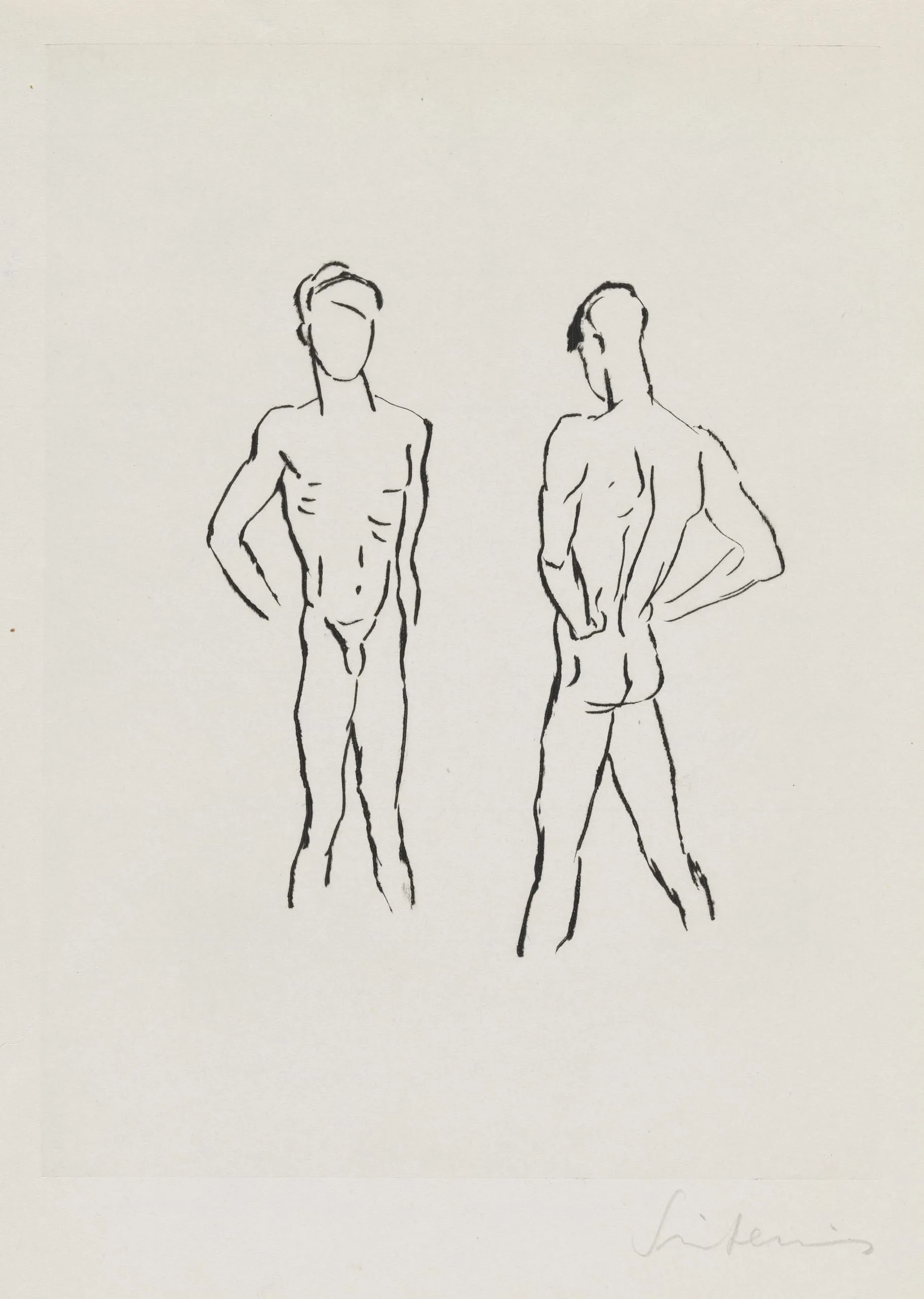 Lithograph or brush drawing of two nude male figures on off-white paper, one facing forward and one shown from behind, rendered in sparse, fluid black contour lines