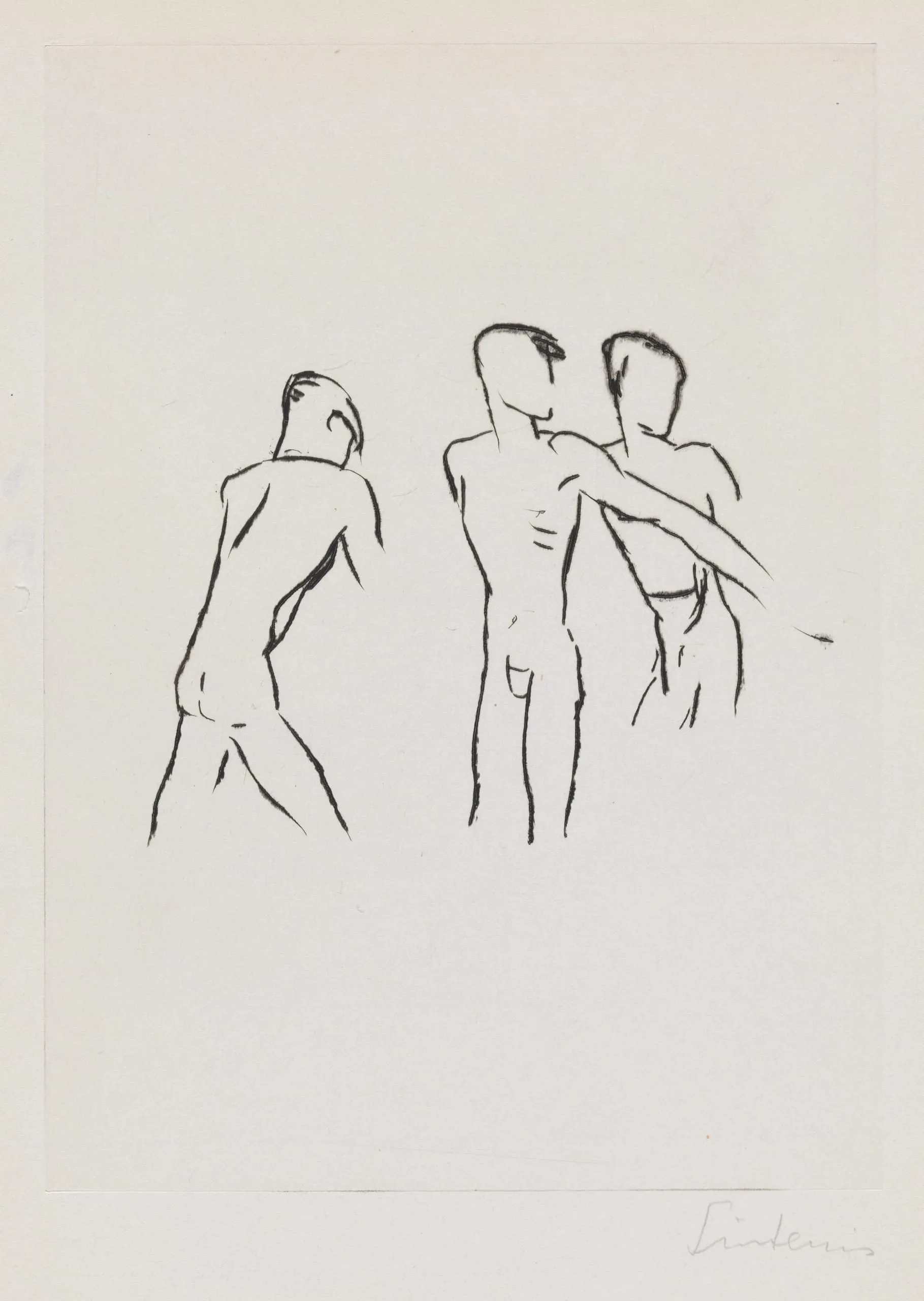 Print with loose black line drawing of three nude male figures on off-white paper, two standing close together to the right and one figure turned away to the left