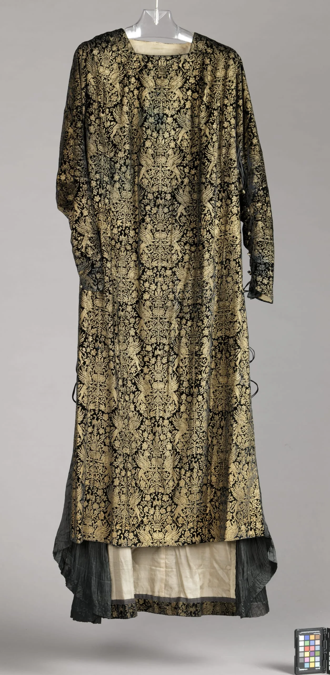 - Silk velvet, printed and embossed and silk twill, pleated, with silk cord and glass beads
