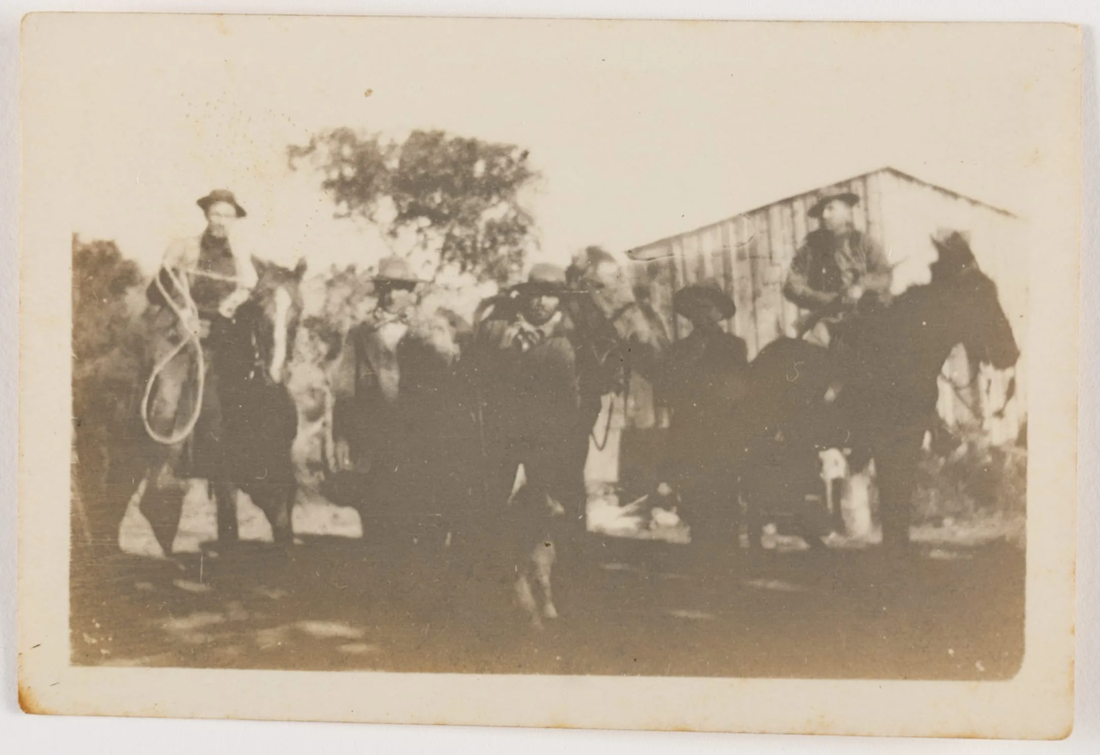 Sepia-toned photograph of several riders on horseback in front of a wooden building, wearing wide-brimmed hats, one holding a coiled rope