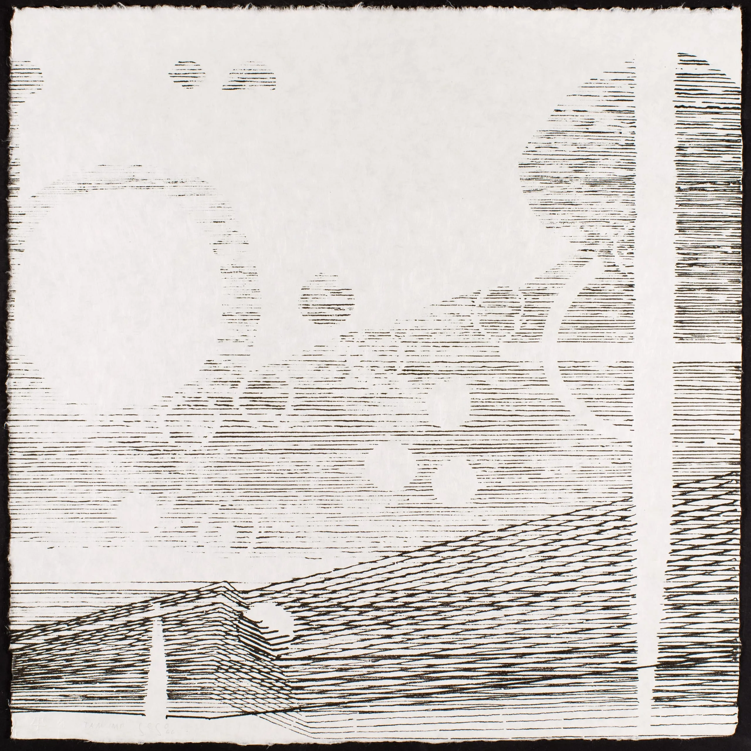 Square woodcut or linocut print with dense black horizontal lines on cream paper; two white silhouette-like forms float in the upper half above a dark band and a hatched diagonal landform below