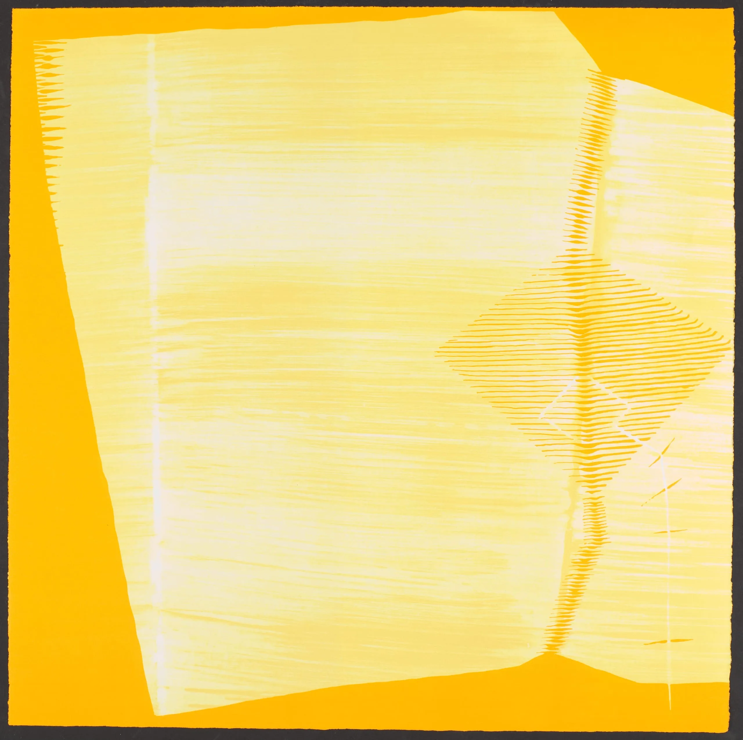 Abstract painting with dense horizontal pale yellow lines filling a large quadrilateral shape against a marigold yellow ground, with a vertical band of dark amber lines forming a diamond shape at the intersection