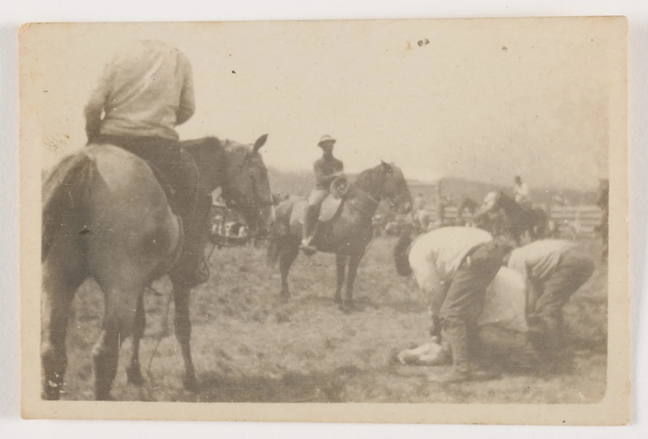 Sepia-toned photograph of several people on horseback and on foot at a dusty ranch or corral, with two figures bending over an animal on the ground