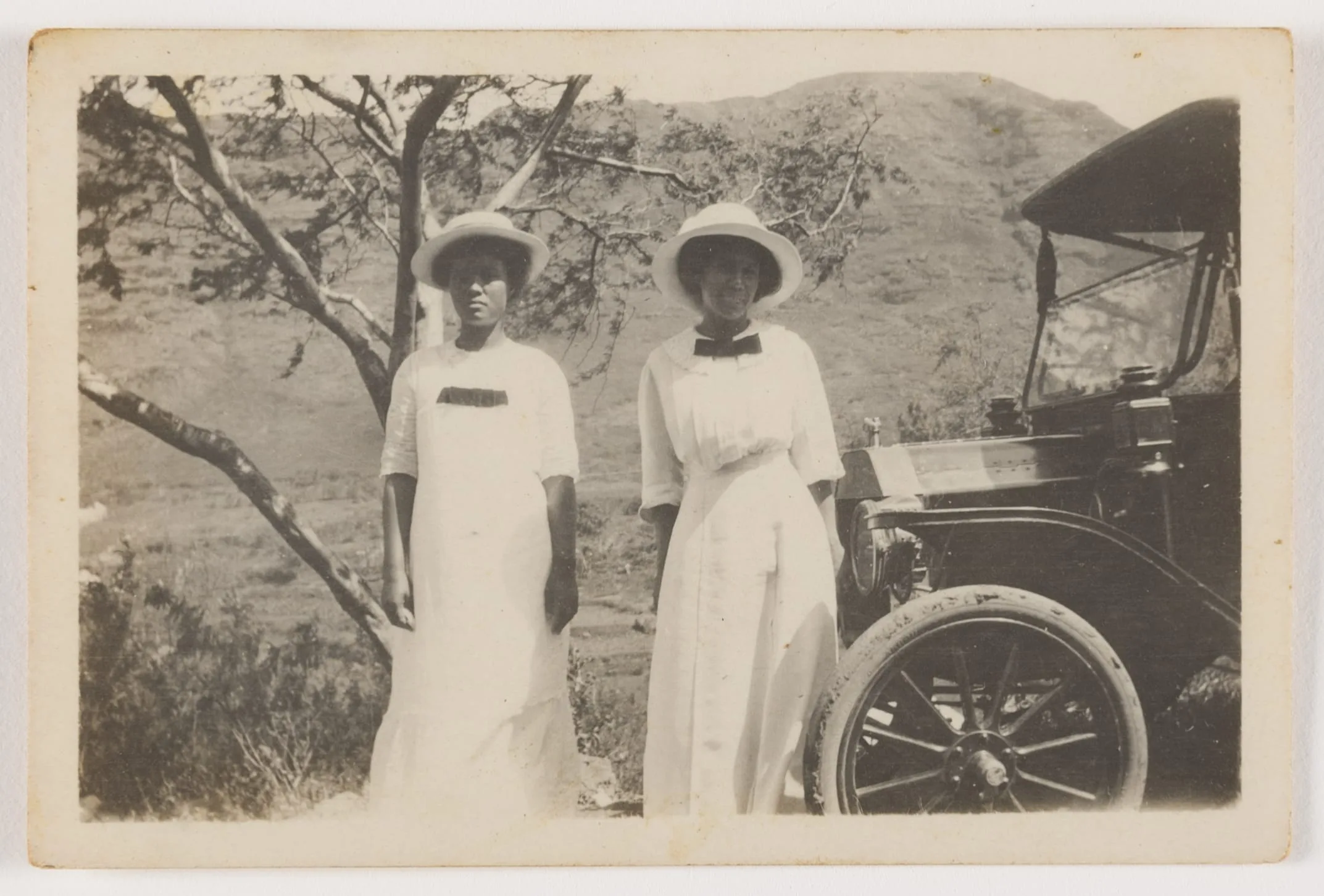 Black and white snapshot photograph of two women with brown skin in white ankle-length dresses and wide-brimmed hats standing beside a vintage automobile, with hills and a bare tree behind them
