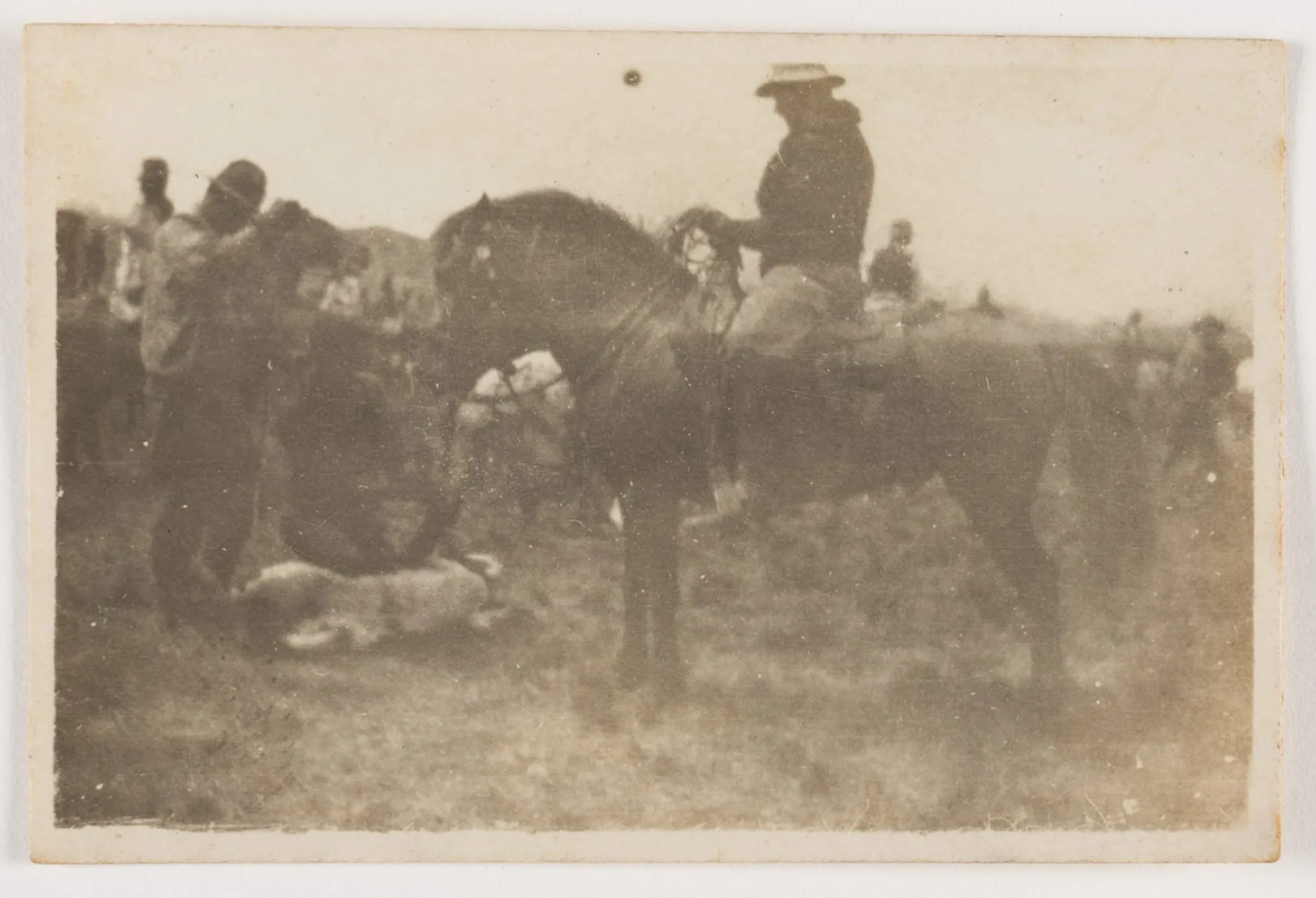 Sepia-toned photograph of a rider on a dark horse in an open field, surrounded by figures on foot and a small animal lying on the ground, with soft focus throughout