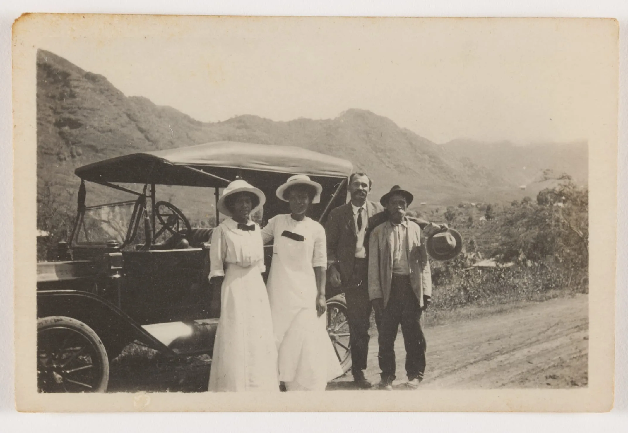 Sepia-toned photograph of four people in early twentieth-century dress standing before a vintage touring car on a dirt road, with mountains in the distance