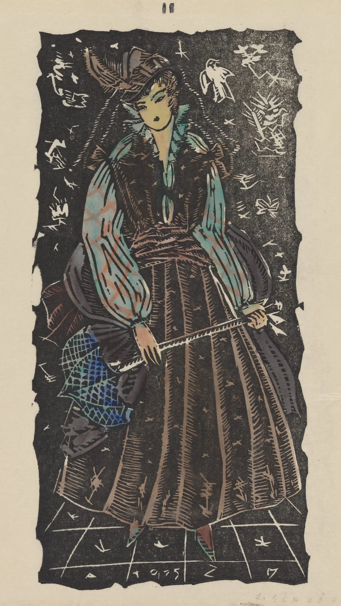 Color woodblock print of a standing woman in a wide-brimmed hat and full-length skirt, holding a thin rod or whip, with teal blouse and brown tones against a dark background scattered with small white marks and symbols.