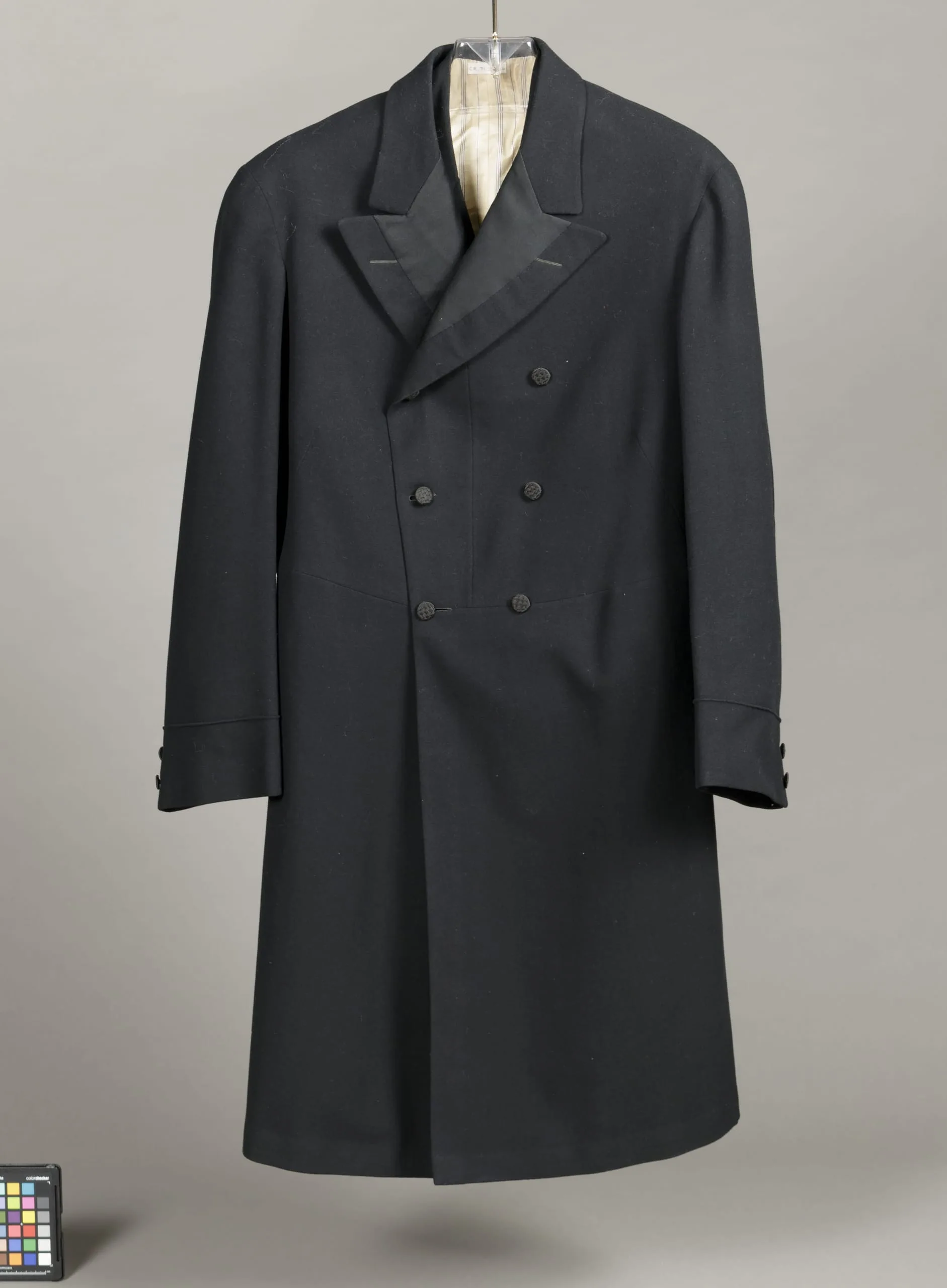 - Wool twill, fulled, and silk plain weave (faille), with silk thread covered buttons.