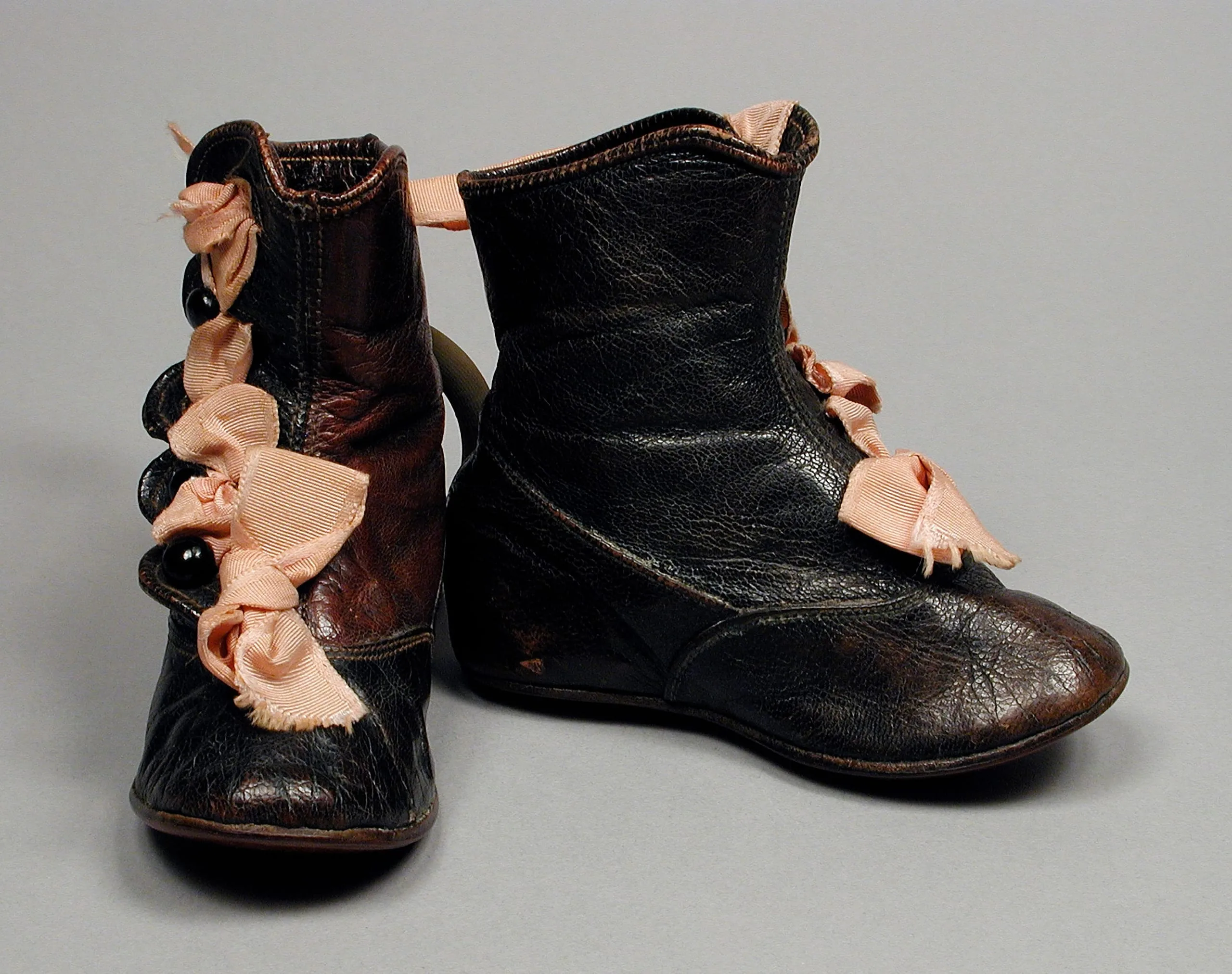 a-b) Boots: Leather with silk grosgrain and enamel buttons.