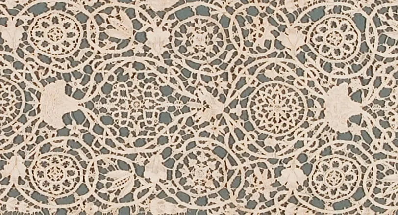 Needle lace fragment in cream-white thread, featuring an allover pattern of circular medallions with radiating geometric centers, interspersed with bird and floral motifs, against a blue-gray backing visible through the open lacework.
