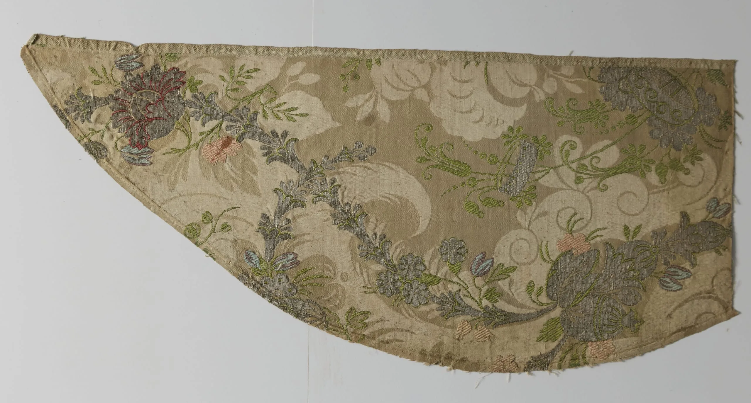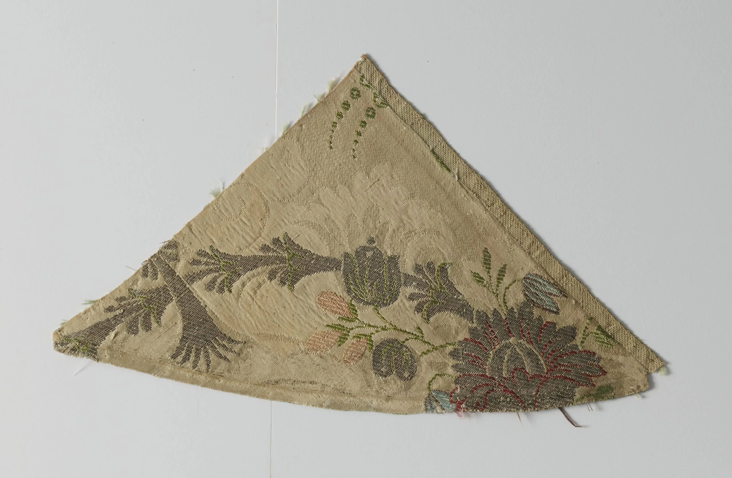 - Silk satin with silk weft patterning and silk and metallic-thread supplementary-weft patterning