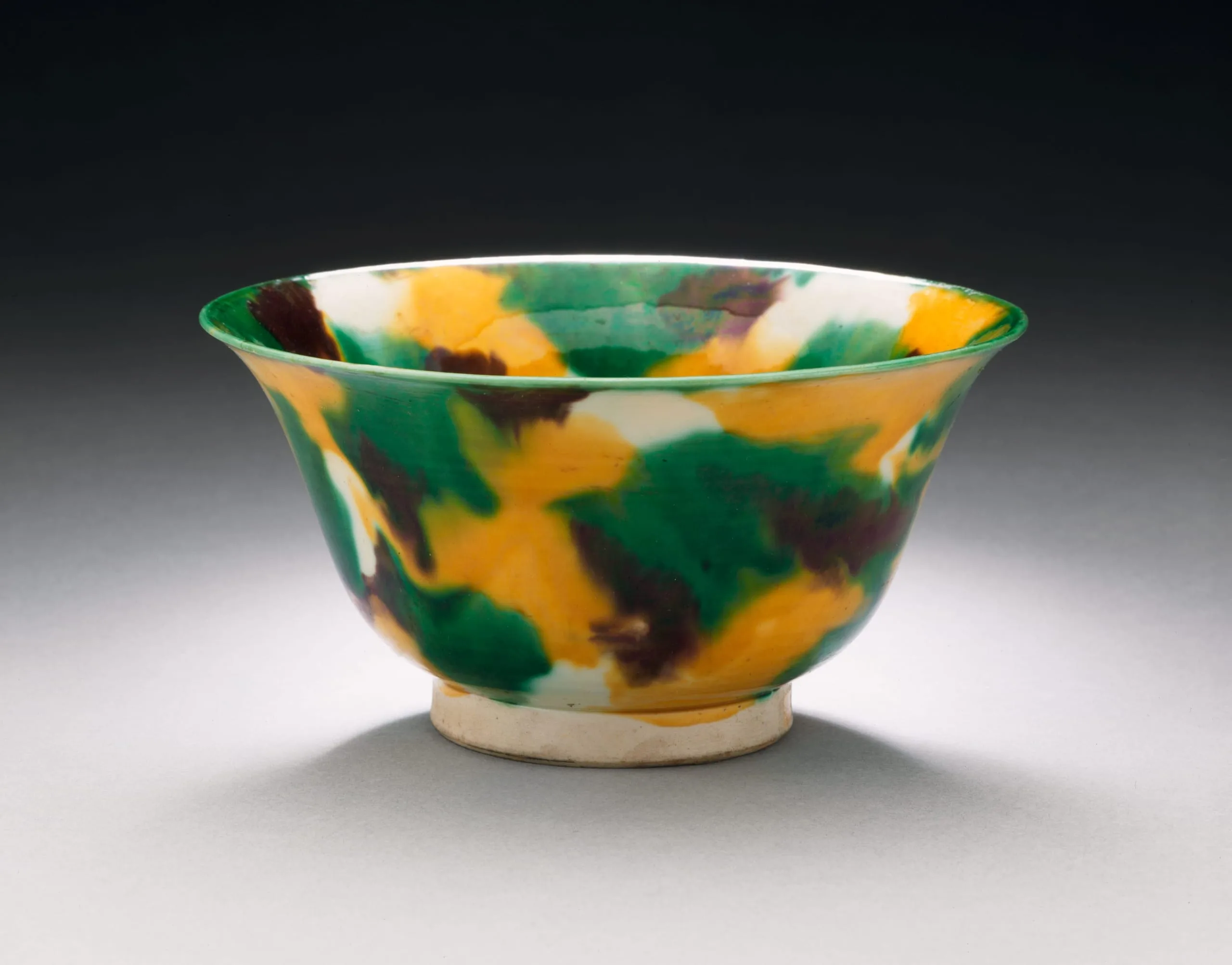 - Wheel-thrown porcelain with enamel decoration ("Egg-and-spinach" glaze)