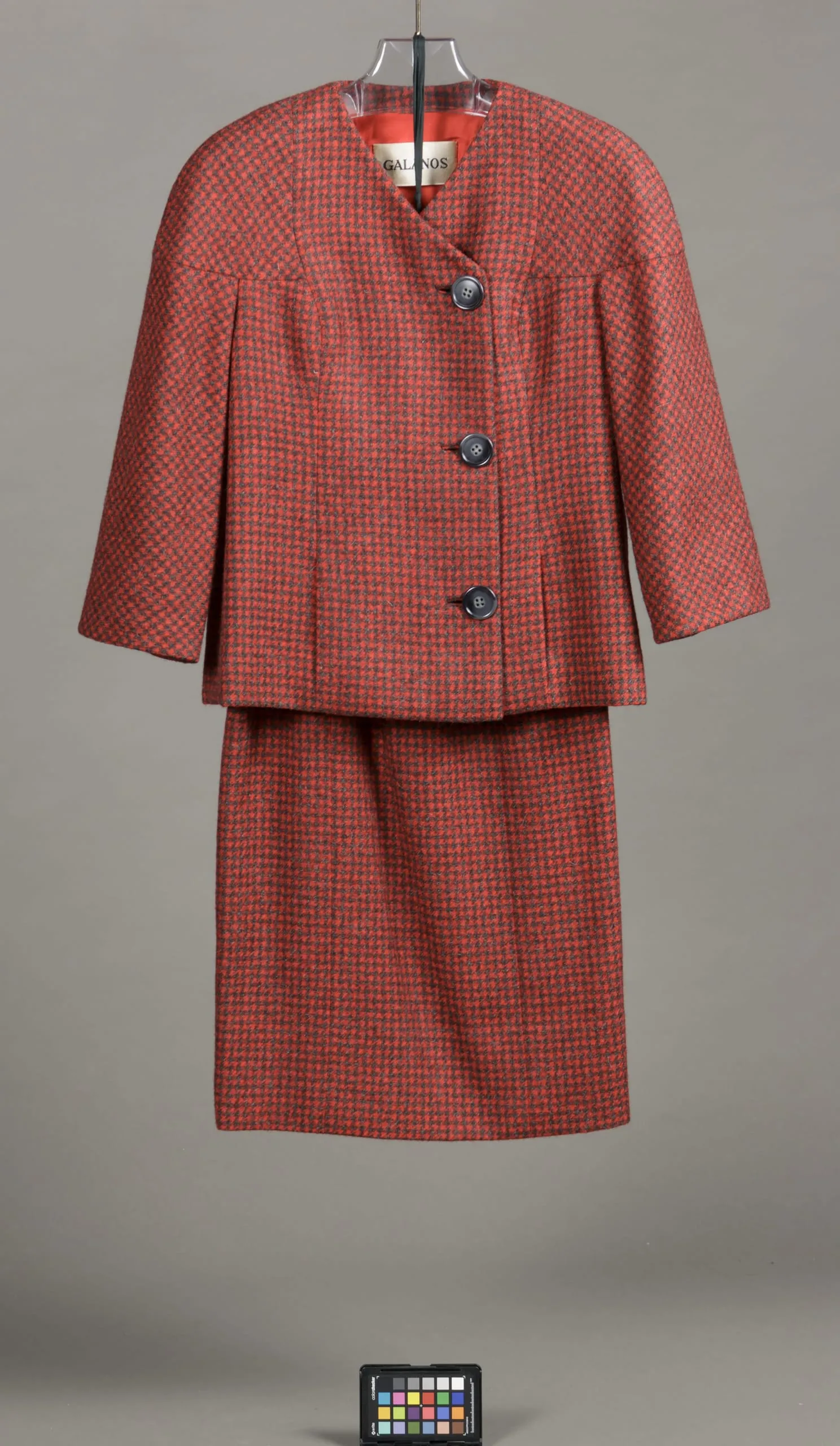 - Jacket: Wool twill, plastic buttons; Skirt: wool twill
