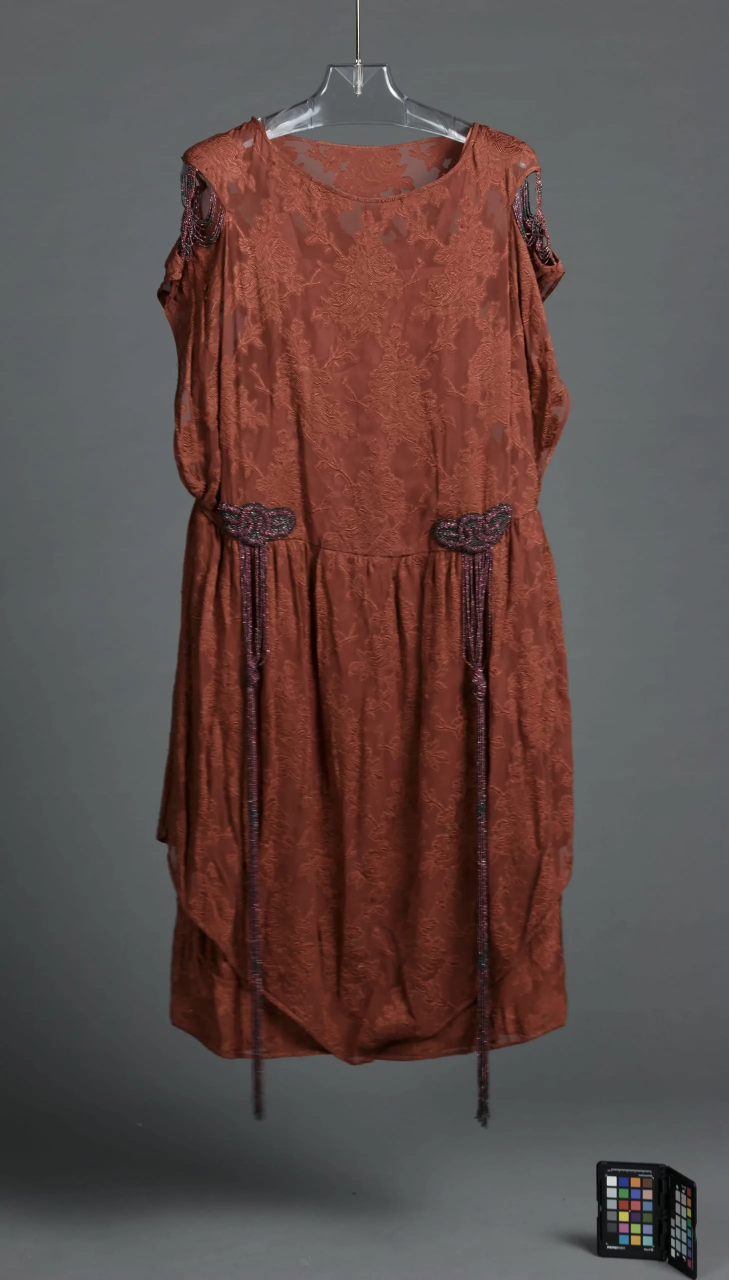 - Silk plain weave (crepe chiffon) with silk discontinuous supplementary warp patterning with glass beads, metal beads, and silk satin