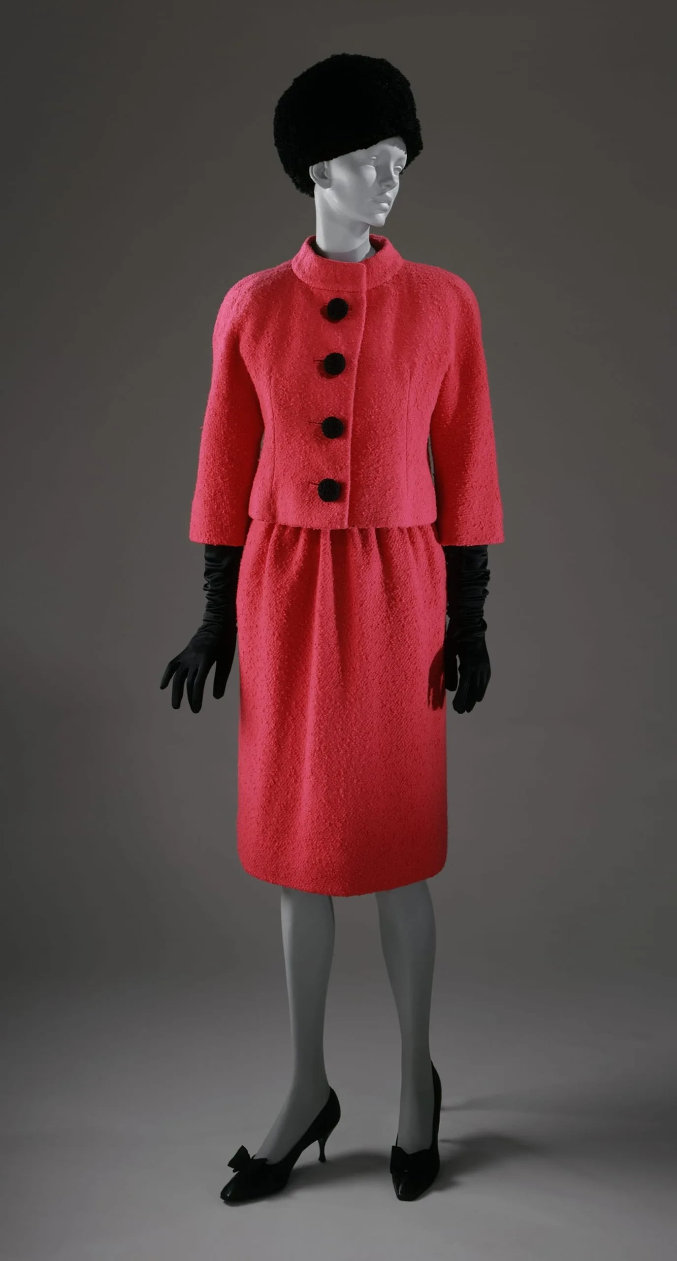 - Jacket: wool twill, silk cord buttons. Skirt: wool twill. Blouse: silk twill.
