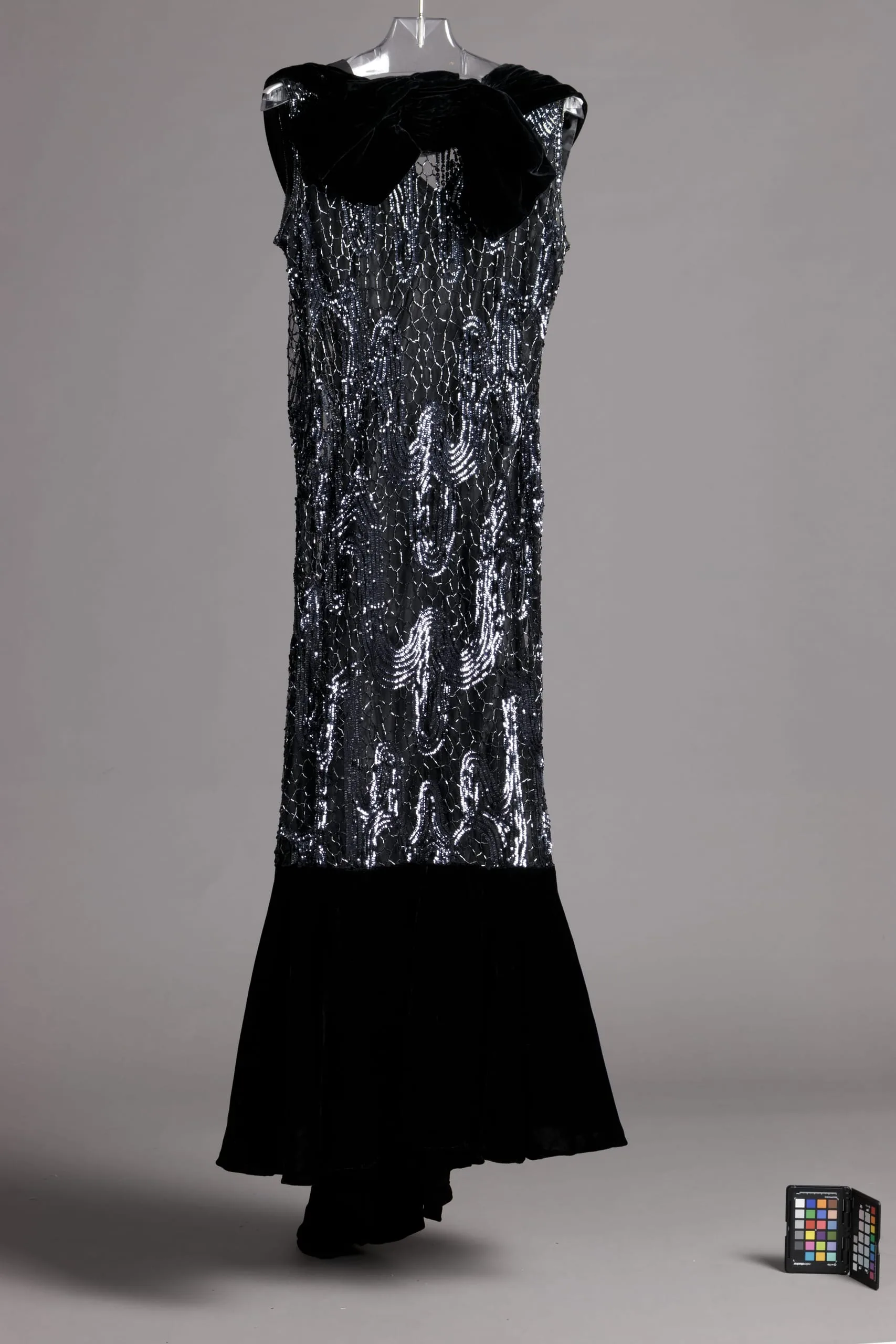 Dress: silk net and silk velvet with glass beads and sequins; Slip: silk plain weave