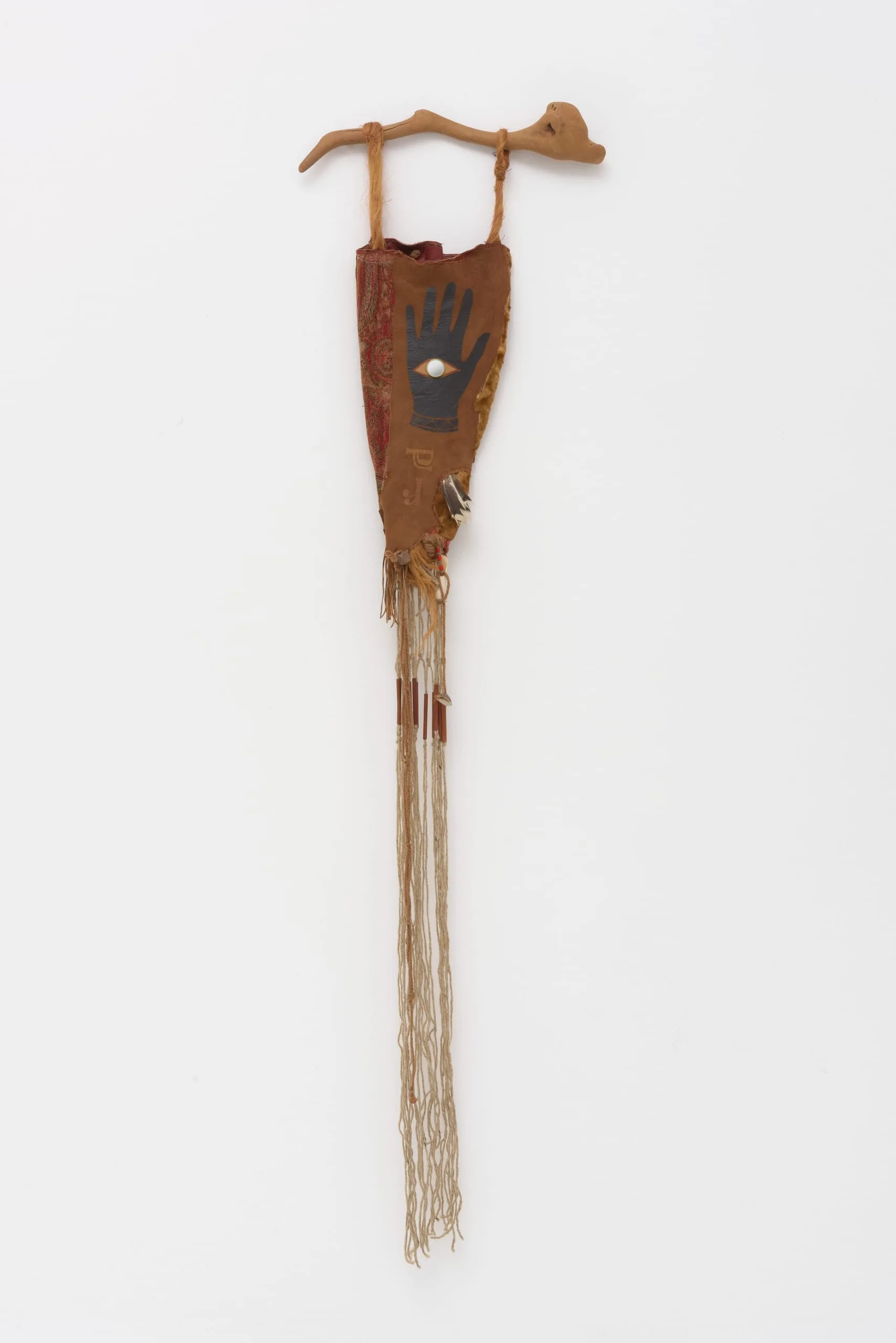 Mojo Bag #1 Hand is one of a number of works Betye Saar made in the early 1970s using a group of cowhides given to her by Alonzo Davis, co-founder of the Brockman Gallery in Los Angeles (which supported Black artists including Saar, Charles White, David Hammons, Maren Hassinger, John Outterbridge, Noah Purifoy, and Senga Nengudi). The piece reflects the influence of Saar’s visit in 1964, with her friend and fellow artist Hammons, to the Field Museum in Chicago. As the artist has described it, “Before [that visit], I was using symbols that were more Eurocentric. But when I went to the Field Museum, in the basement they had all this work from Africa, Oceania, and even China and Japan—everything that wasn’t European, which was displayed nicely upstairs. All this other strange stuff was in the basement…this weird, fetish, magic stuff. They were organic materials—leather, hair, shells, bones. So when I came back to Los Angeles, I started collecting this. When Alonzo gave me those animal hides, I just got into it.”