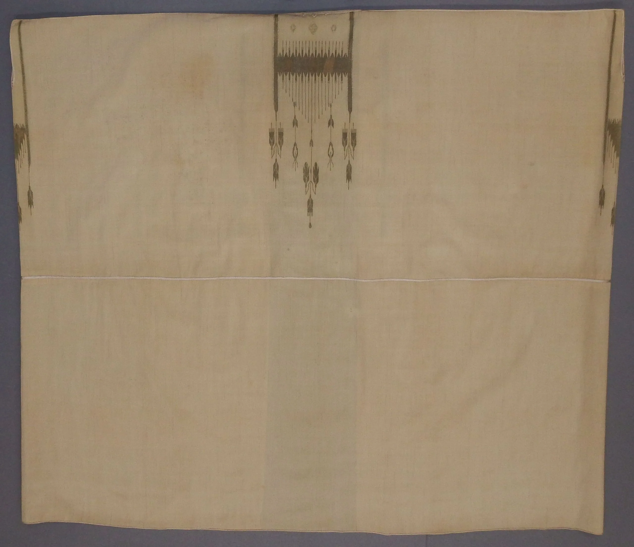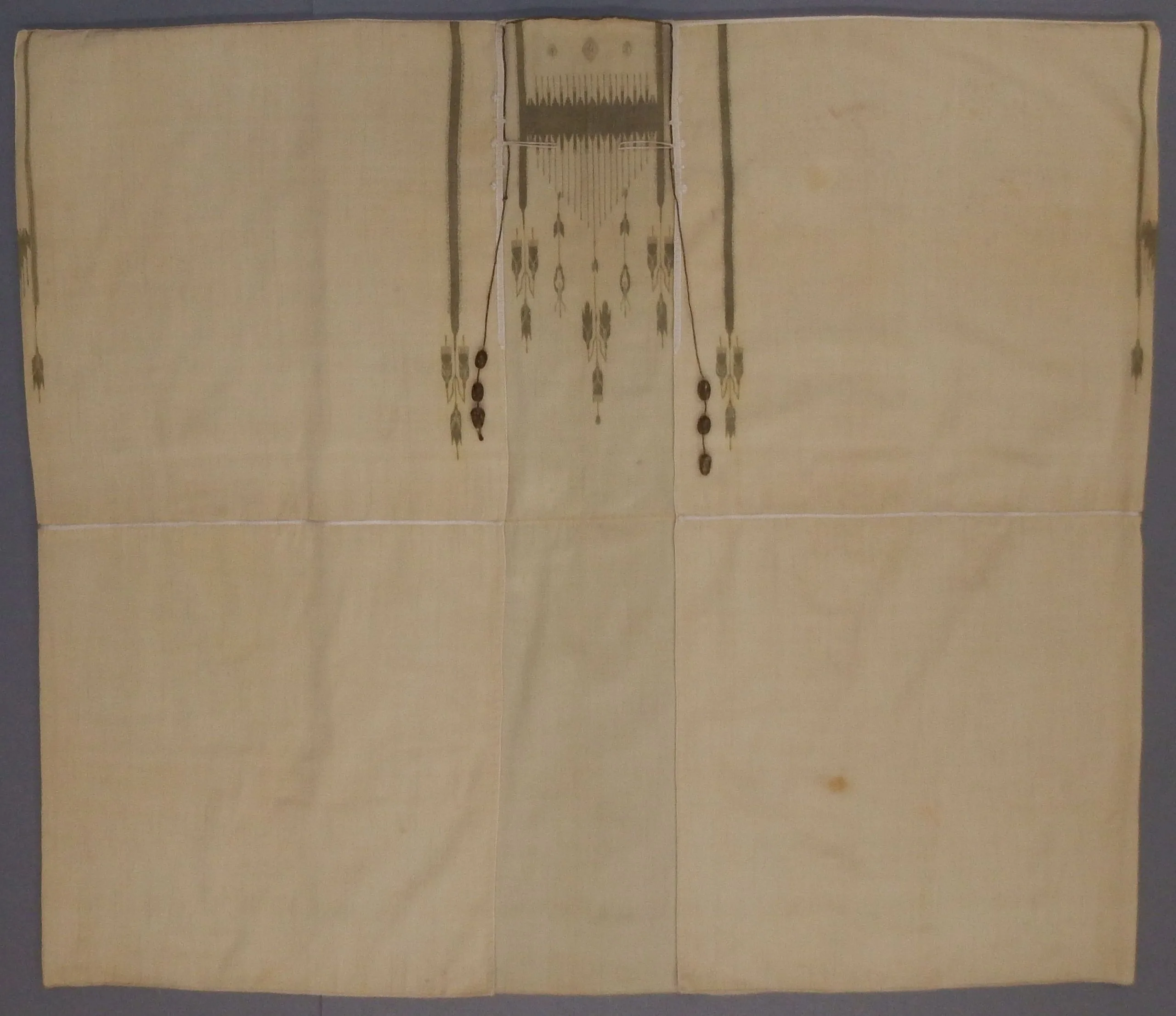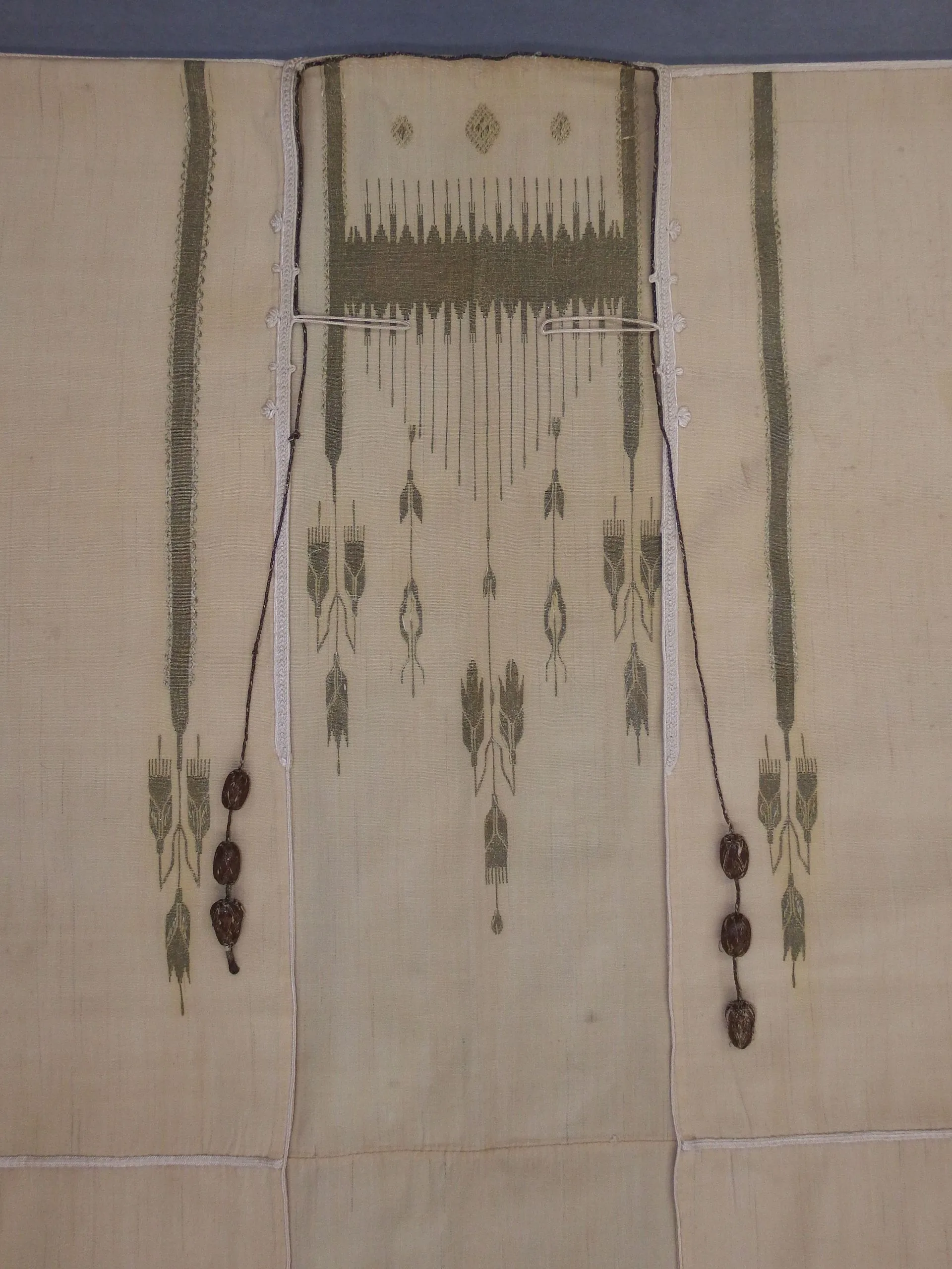 - Cotton, wool, and metallic thread slit tapestry weave with metallic thread discontinuous supplementary-weft patterning (brocade), silk braid trim and silk-thread-covered toggles