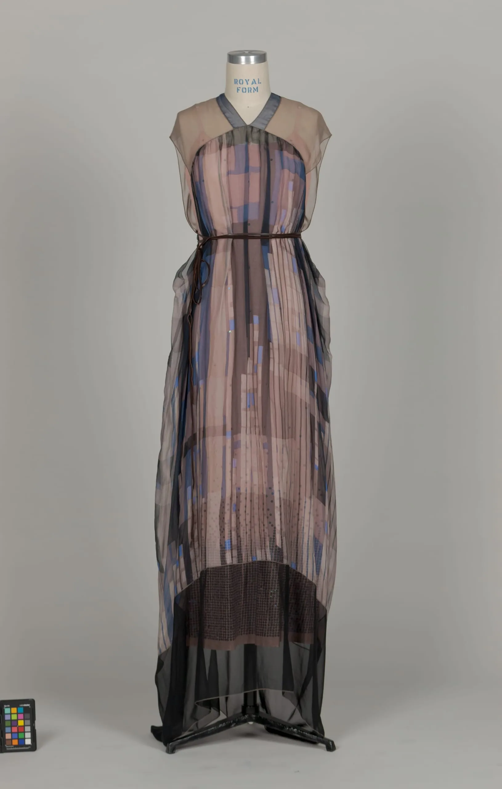 - Silk plain weave (chiffon), printed, with sequin embroidery, leather