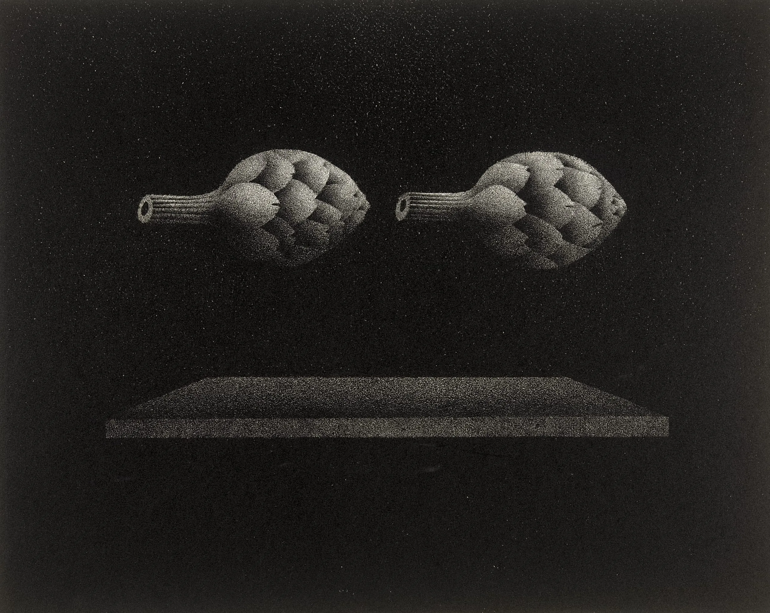 Print using stippled dots on dark paper, two artichokes floating horizontally above a flat rectangular platform against a black background