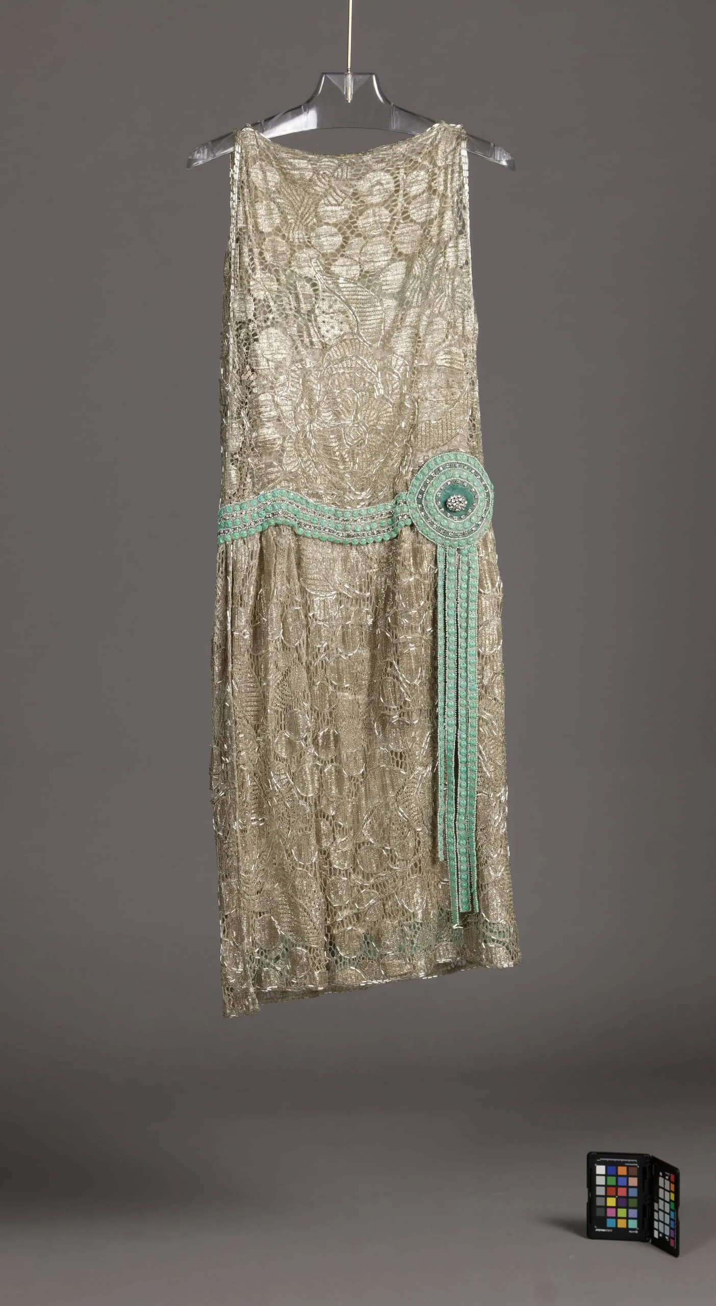 - Cotton and metallic thread lace, silk plain weave, and silk and metallic thread satin (lamé), with glass and celluloid beads, metallic thread embroidery, crystals, and silk satin ribbon