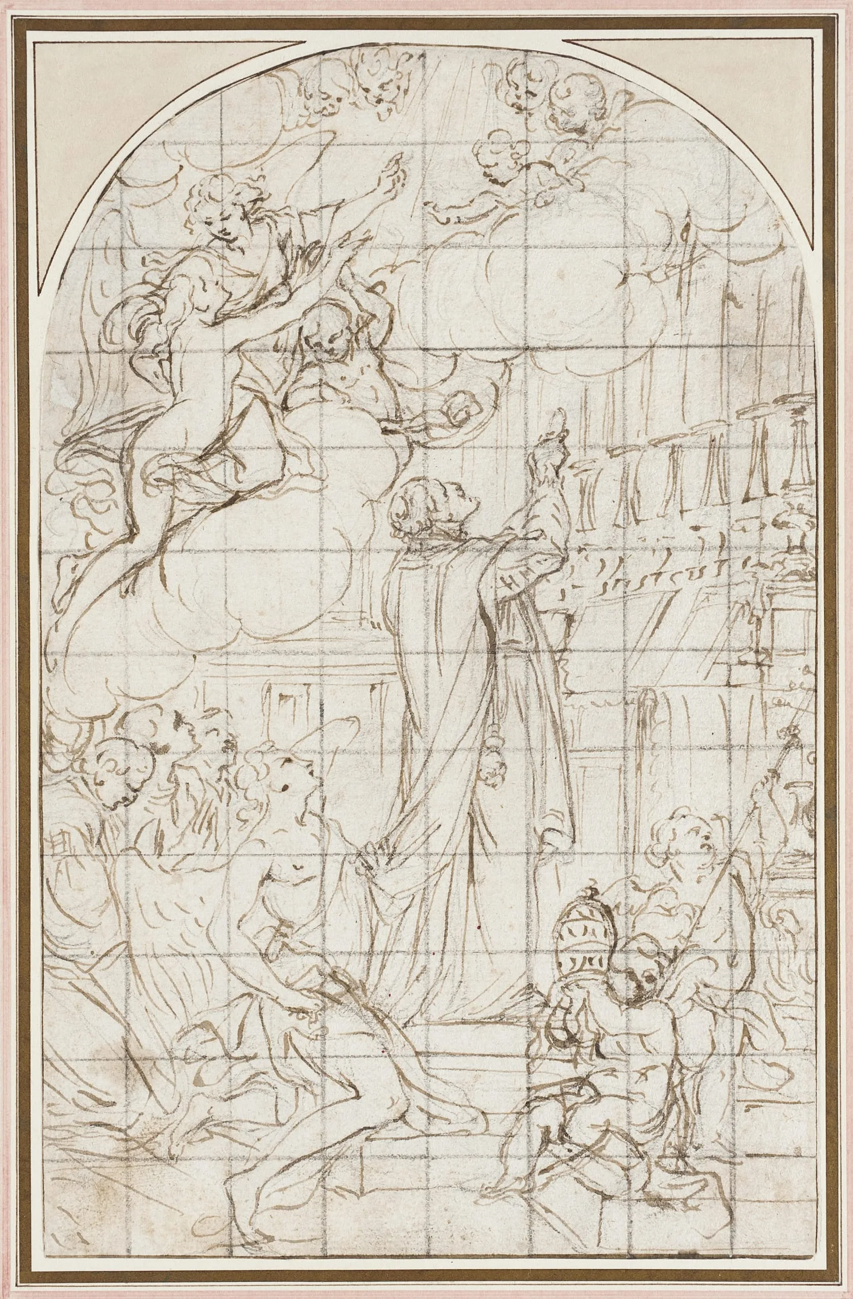 - Pen and brown ink over traces of black chalk, squared for transfer