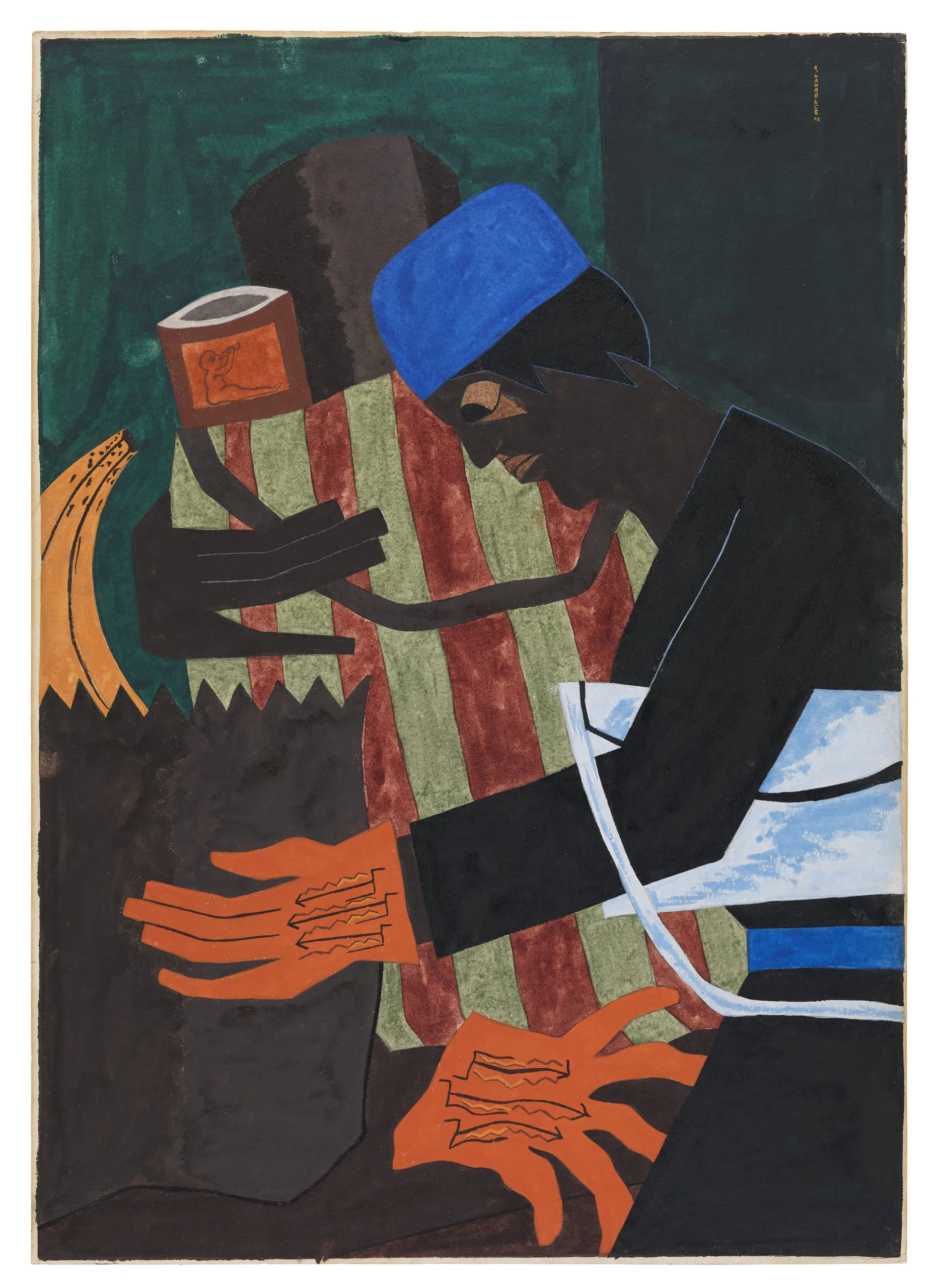 Although Lawrence believed that you cannot “tell a story in a single painting,” he occasionally worked outside the series structure. Woman with Groceries is a magnified close-up of large cubic forms, painted in bold, dynamic colors. The oversized hands that dominate the composition can be seen as symbols of labor, tenacity, and strength. While the work might initially appear abstract, the forms soon become recognizable: the red and white striped bag dominates the center, and the bright yellow banana counters the red glove, white purse, blue belt, and hat. The figure seems arrested in motion, accented by the elegant blue outlines. Lawrence’s characterization of women stems from his observation of the perseverance of the courageous women in the Harlem community, often poor, hard-working mothers raising their families.