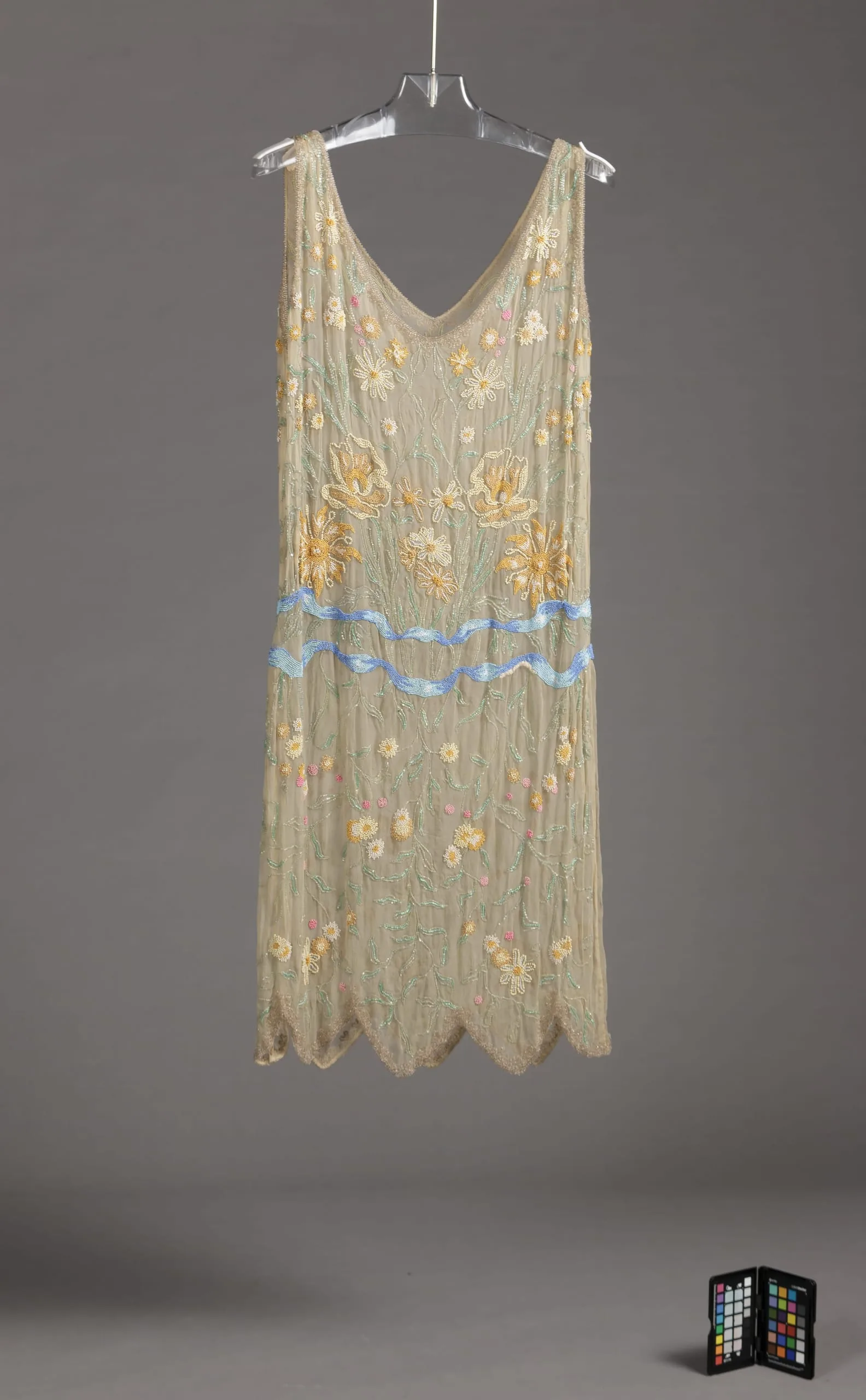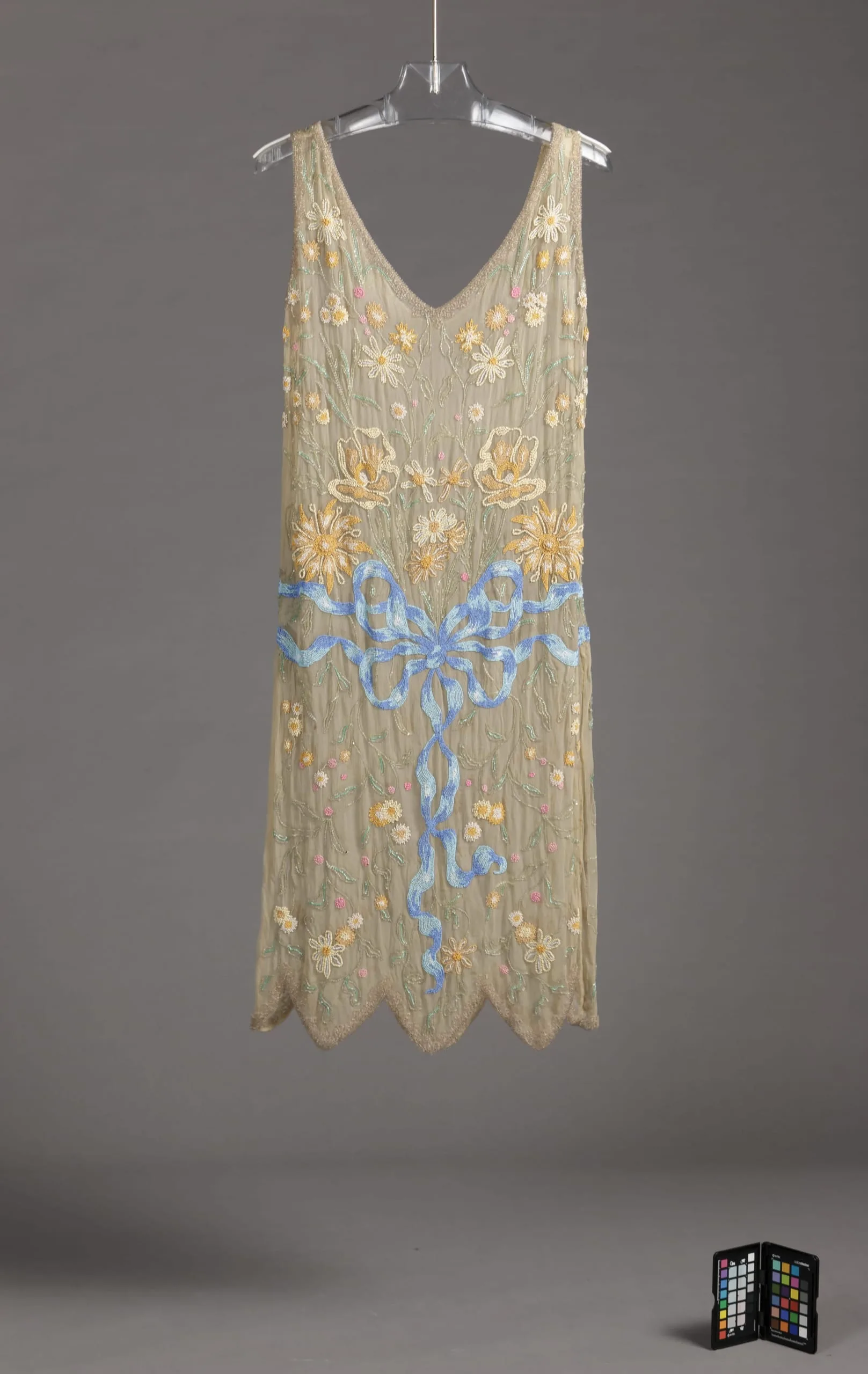 Sleeveless 1920s evening dress in ivory lace, displayed on a hanger, with embroidered floral motifs in yellow and white, a pale blue satin ribbon bow at the hip, and a scalloped hemline.