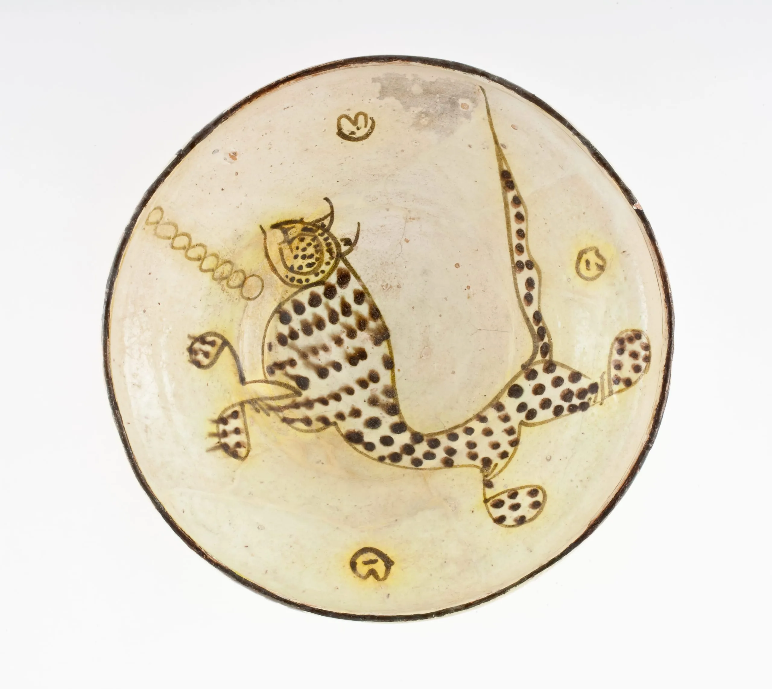 Ceramic dish with cream and straw-yellow glaze, decorated in dark brown with a spotted, leaping feline and small leaf motifs near the rim