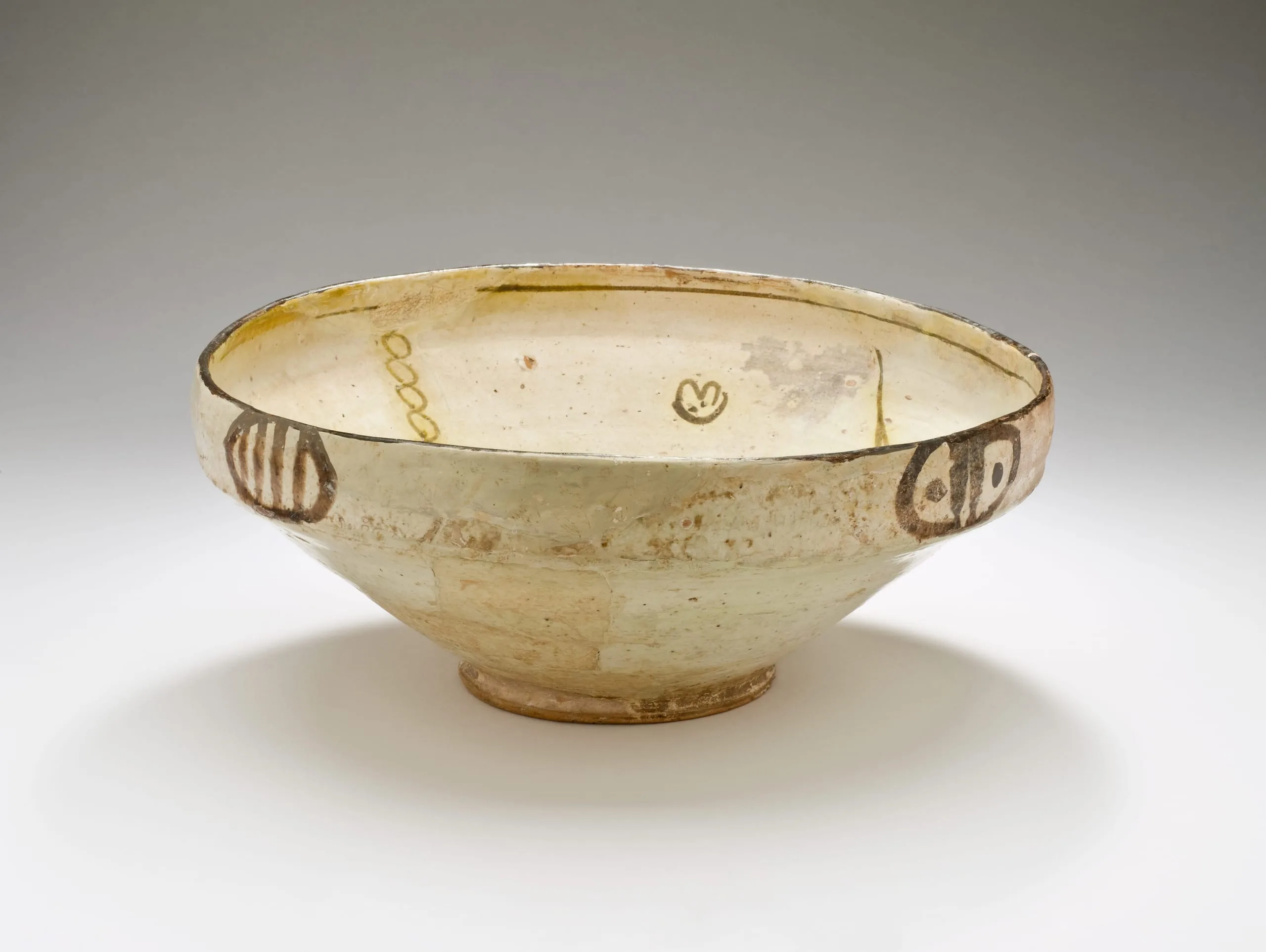 Ceramic bowl with flared rim and low foot ring, covered in an off-white slip glaze with painted brown and yellow decorative motifs including striped oval shapes and small circular marks around the exterior and interior rim.