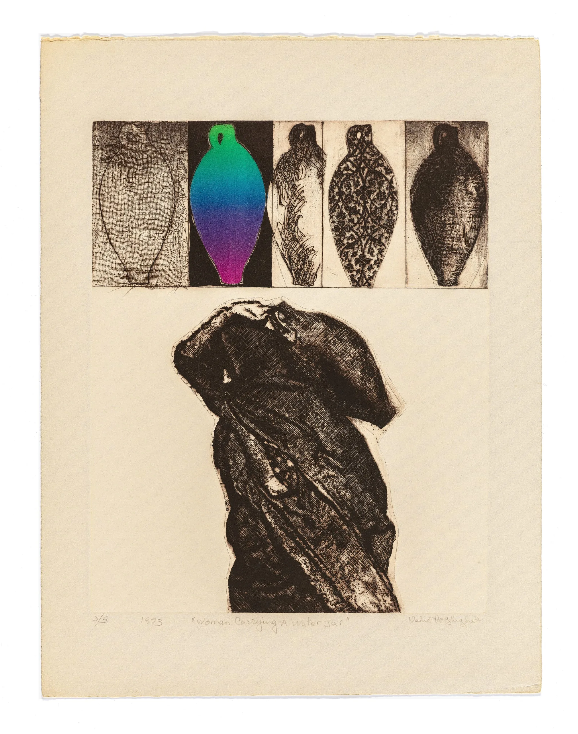 Nahid Hagigat’s oeuvre focuses on the lives of Iranian women, often touching on political issues such as state surveillance and veiling. After she left for the United States before the 1979 Islamic Revolution, her sister sent her photographs of women from villages in the Kurdistan and Baluchestan regions, which she would use as inspiration for her work. Here, the top of the print shows five different representations of traditional water jugs that were produced into the twentieth century. Placed above a woman carrying such a jar, the repetitive motif mirrors the monotony of women’s difficult and tiring job as water carriers. The woman whose face is obscured by her chador labors under the weight of a jar, her arm mimicking the handle of the vessel, as if she is morphing into her task.