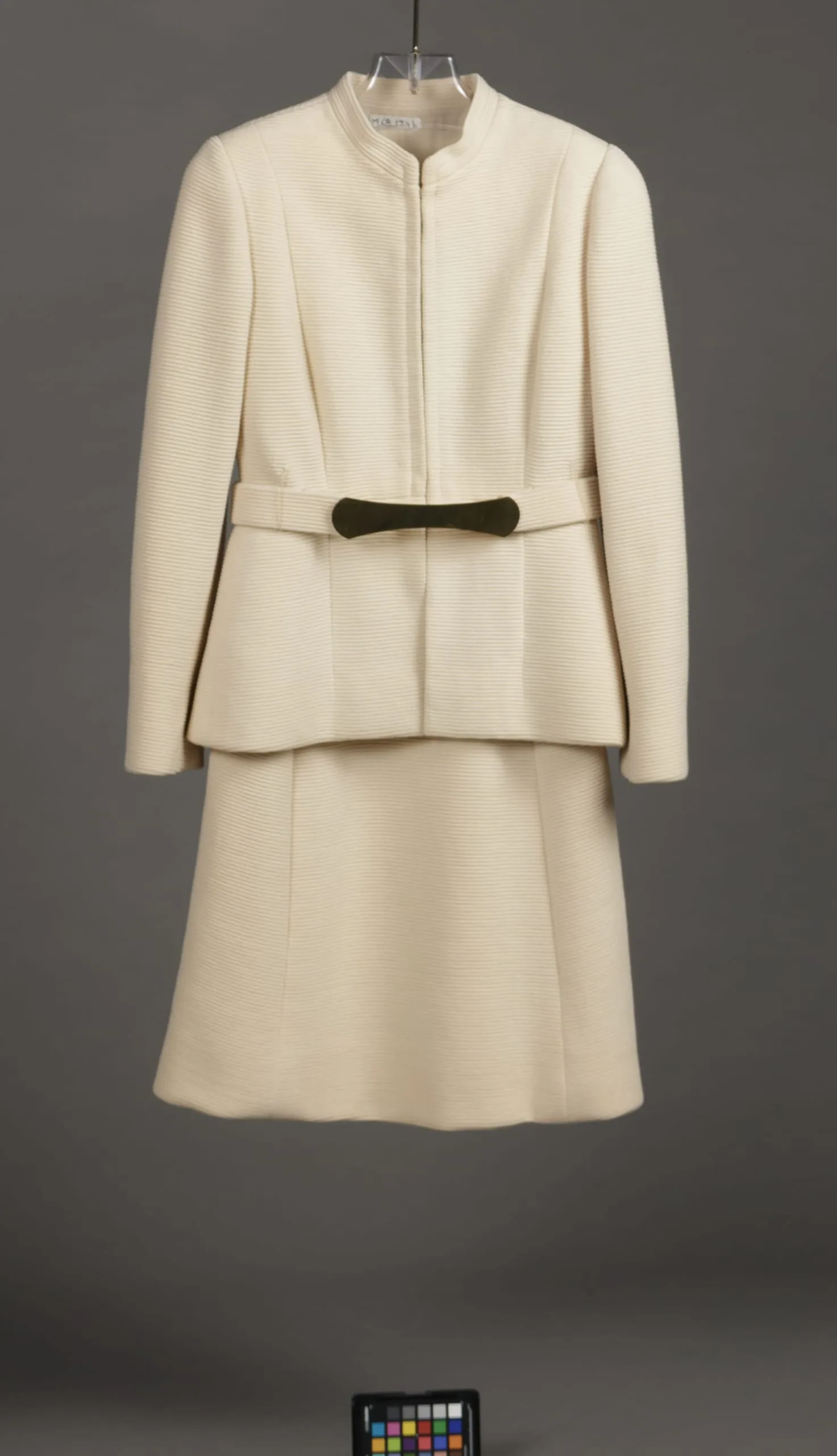 - Jacket and Dress: cotton knit; Belt: cotton knit and metal