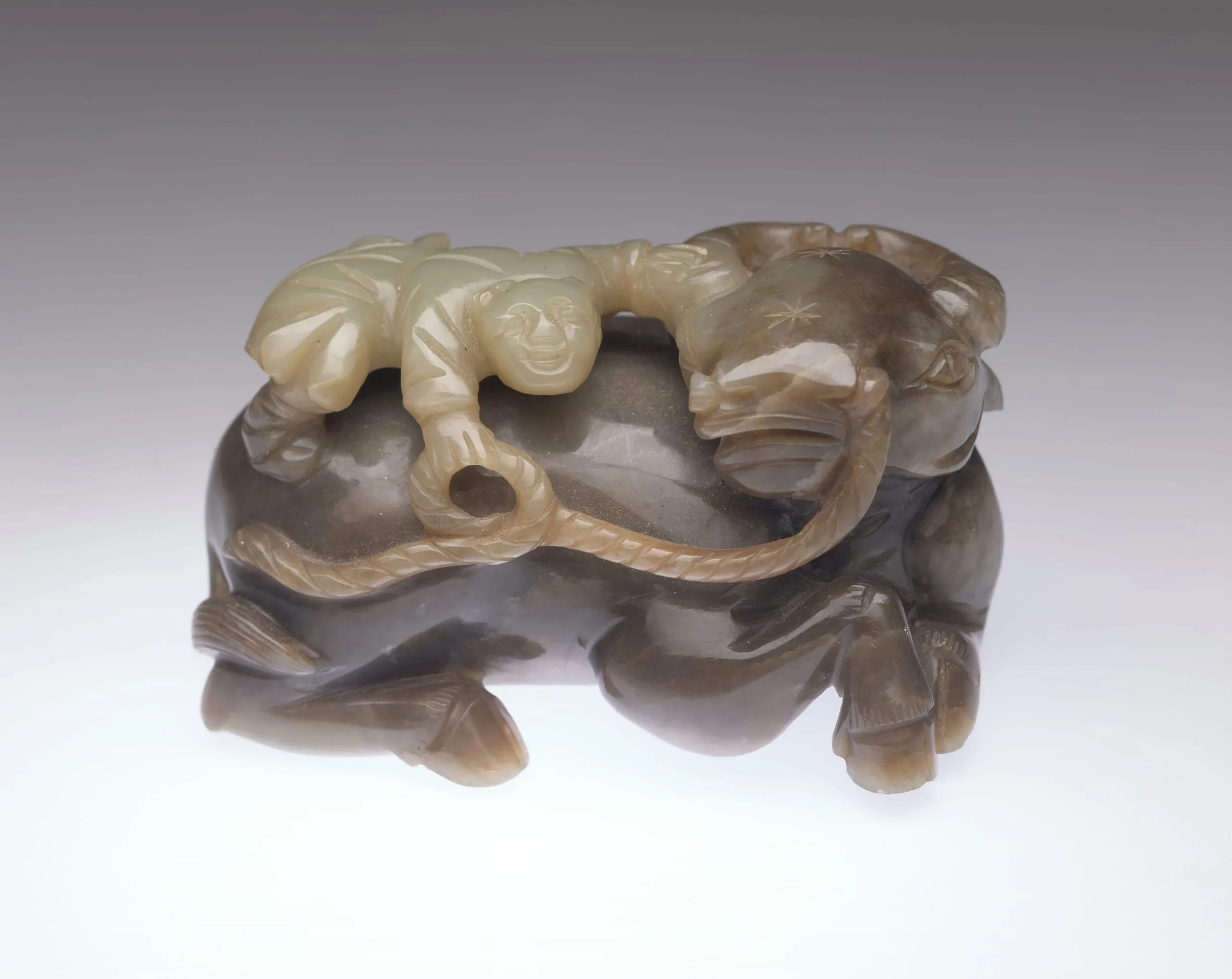 Small jade carving of a crouching animal with a recumbent human figure on its back, two-tone celadon green and charcoal gray stone, highly polished