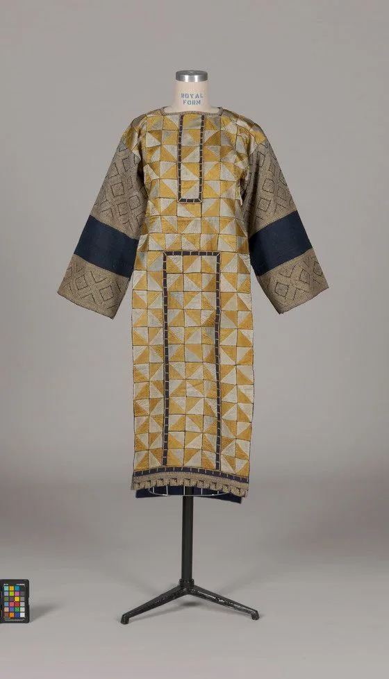- Cotton plain weave, wax-resist dyed (batik) with silk satin, appliqués and silk embroidery
