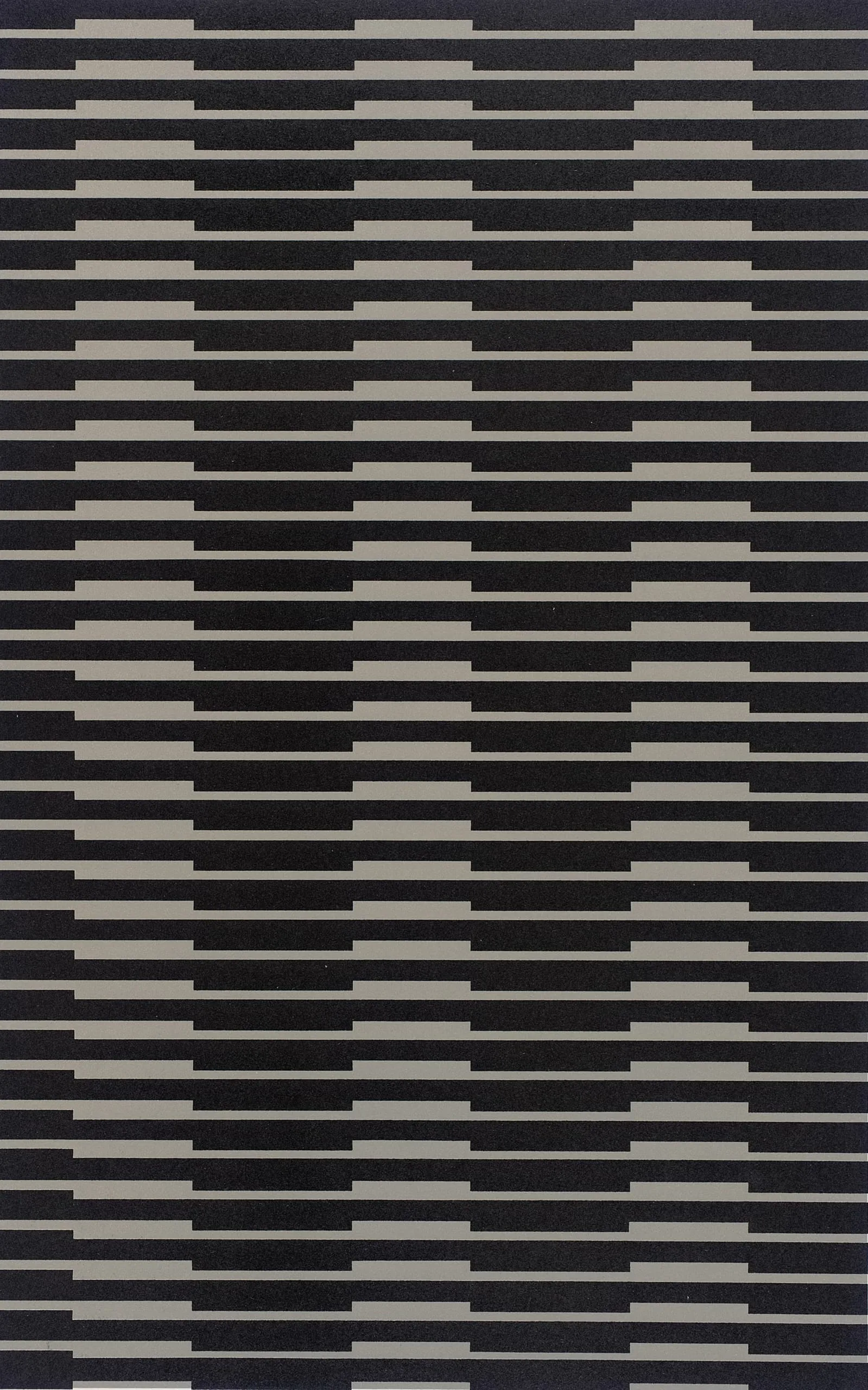 Vertical abstract painting with staggered rows of pale gray horizontal bars on a near-black ground, creating a repeating, allover geometric pattern