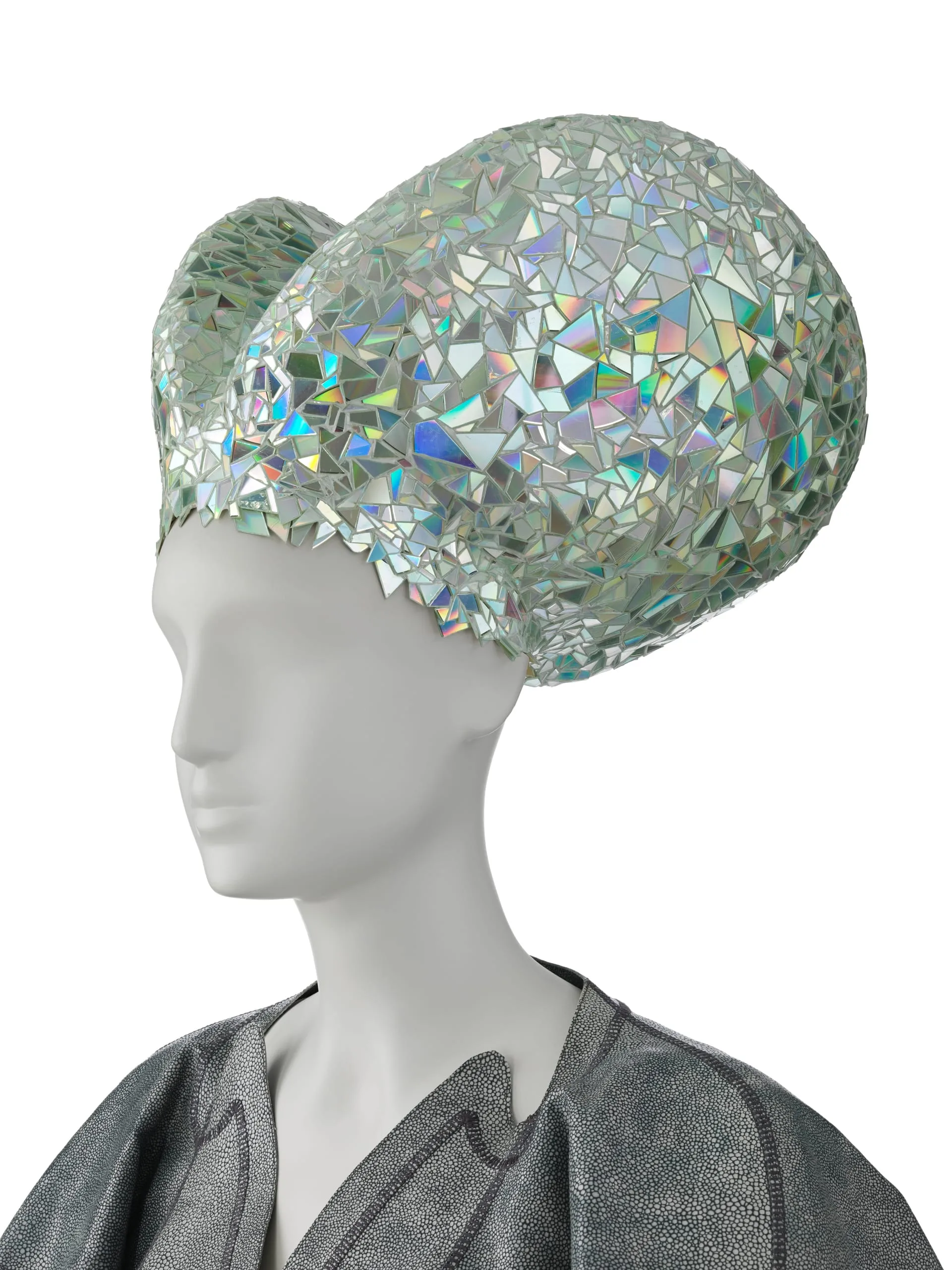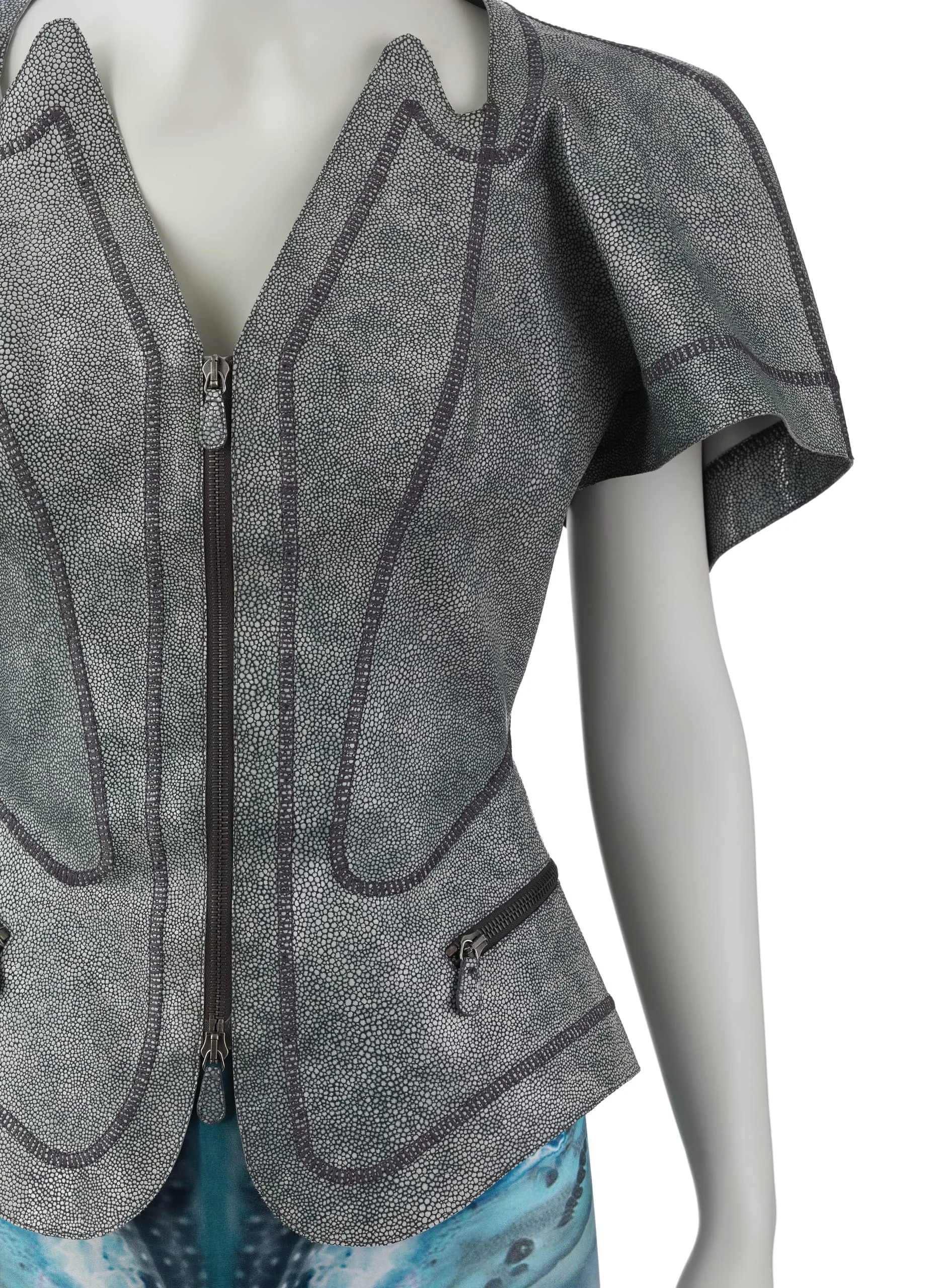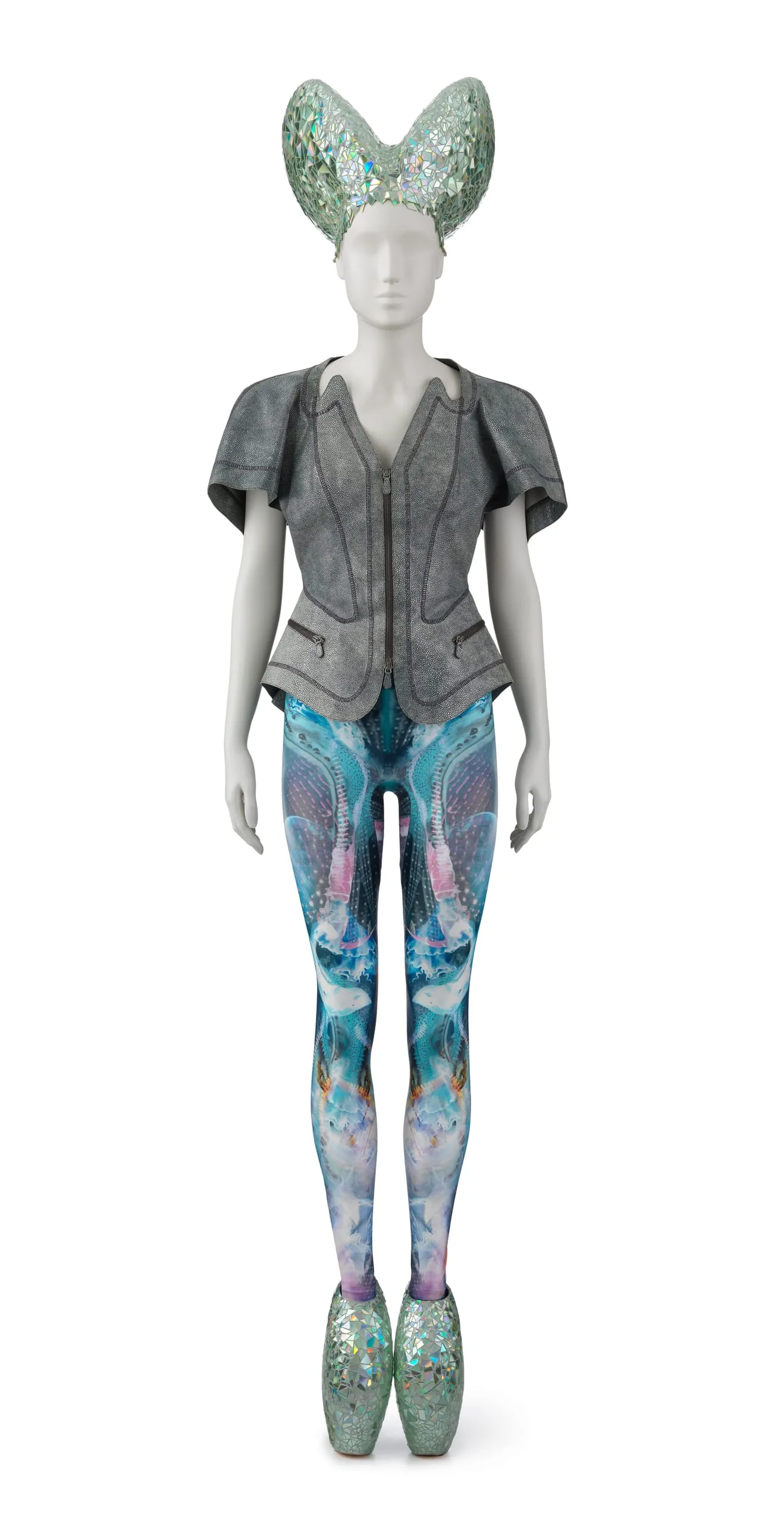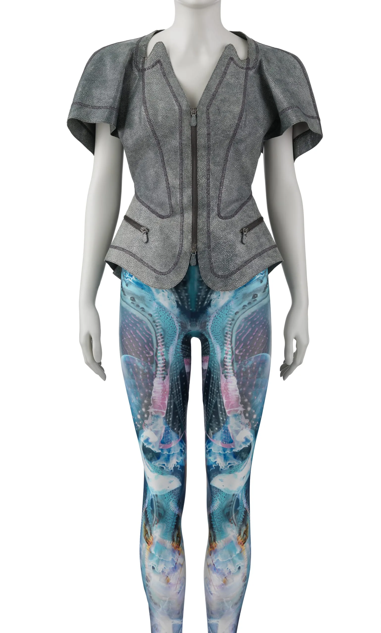 - a) Bodice: Faux stingray leather (shagreen) and metal; b) Leggings: Nylon/polyamide and elastane knit, digitally printed