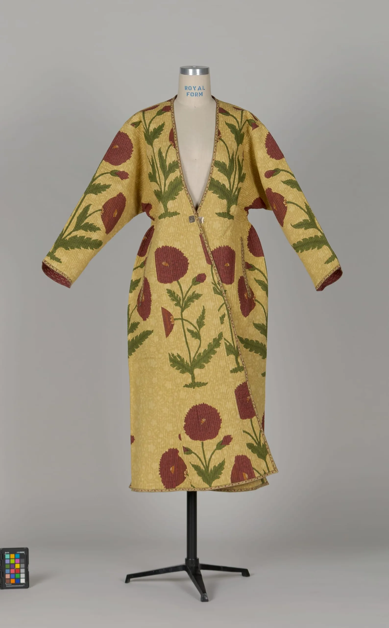 Textile garment, a golden yellow wrap coat with large brick-red poppy-like blooms and olive green leaves in an allover pattern, displayed on a mannequin stand