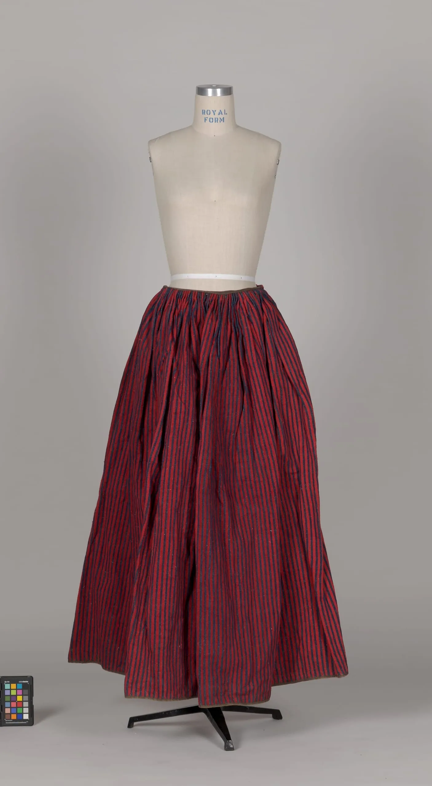 Full-length gathered skirt in red and navy blue vertical stripes displayed on a cream dressmaker's form, floor-length with dense waist gathering and a subtle sheen